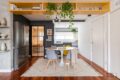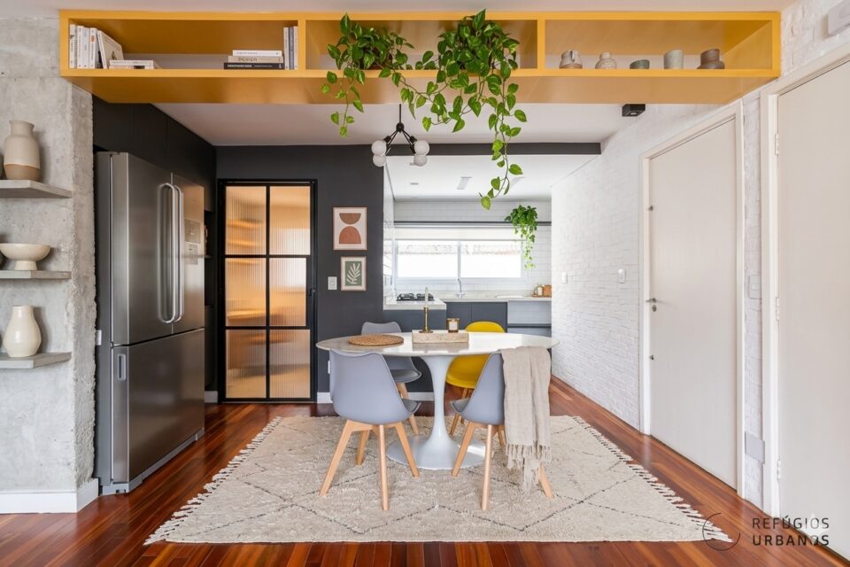 A cozinha, integrada à sala, acompanha o ritmo do apartamento: prática, funcional e com muito charme. Logo ao lado, a área de serviço aparece discreta e igualmente bem resolvida.