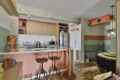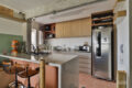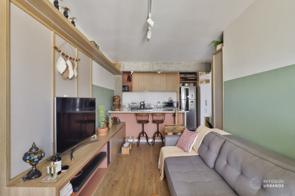 Além disso, tanto na cozinha quanto na sala, há bastante espaço de armários, garantindo organização sem abrir mão do estilo.