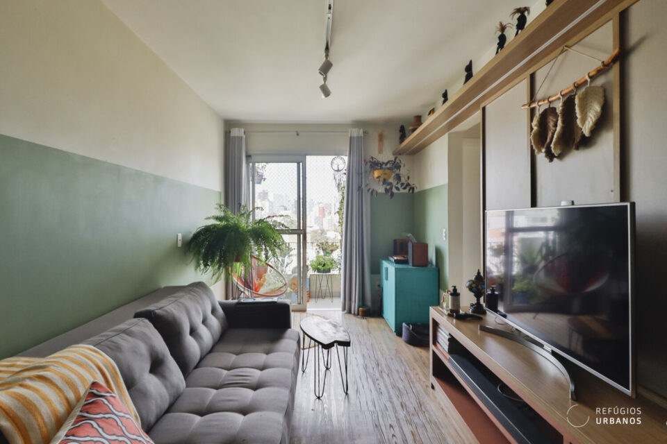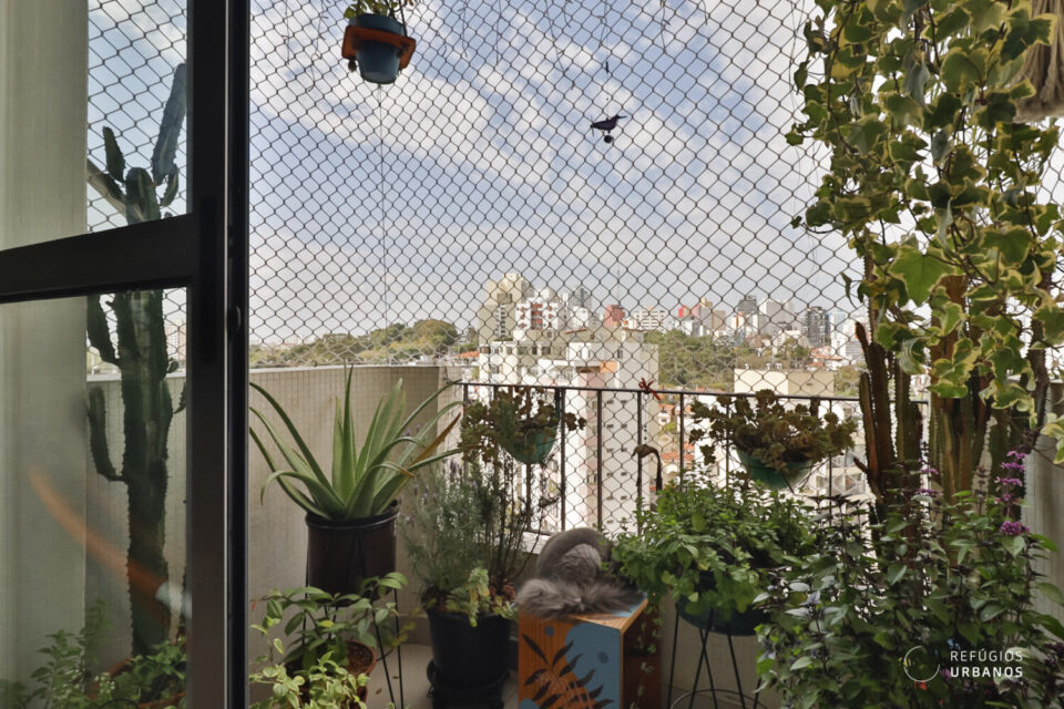 Da sala, temos uma varanda que convida ao relaxamento. É ali que as plantas tomam sol, que o dia começa preguiçoso com um café no fim de semana, ou que a noite termina sob o frescor de uma brisa leve.