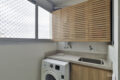 Nos “bastidores” da casa, a área de serviço guarda um lavabo e uma despensa, oferecendo praticidade e organização sem interferir na beleza dos espaços sociais.