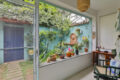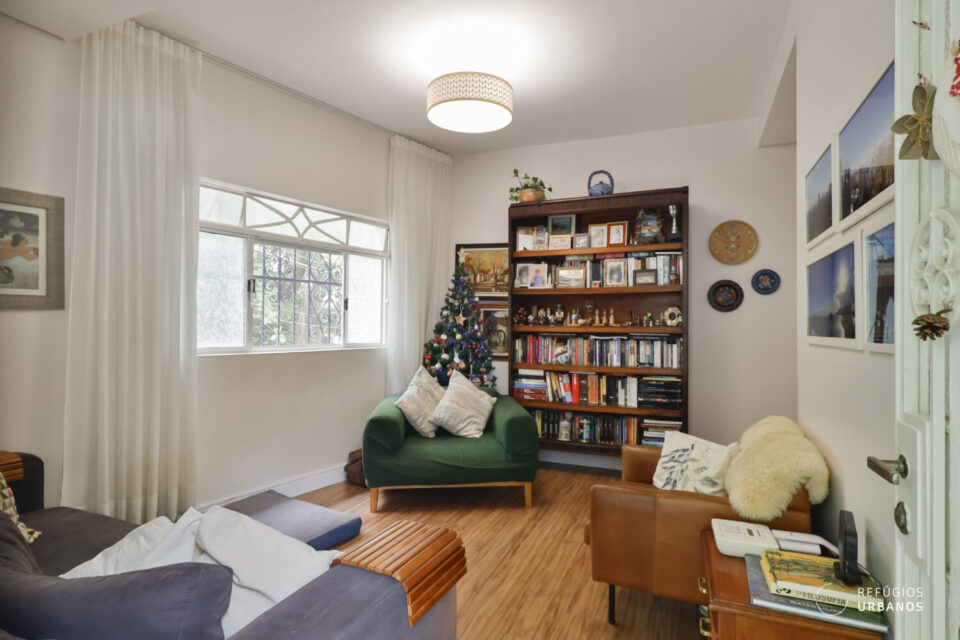 Somos recebidos pelo gostoso alpendre, característica das construções da época e dois ótimos quintais. O primeiro, nos conduz área social da casa, composta por uma sala iluminada, com janela lateral voltada para a praça.