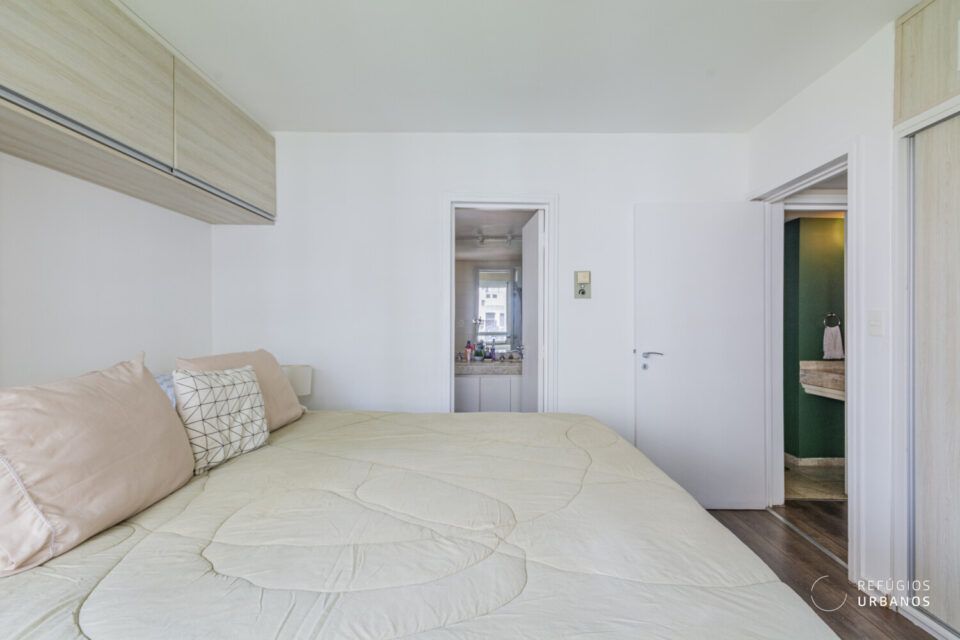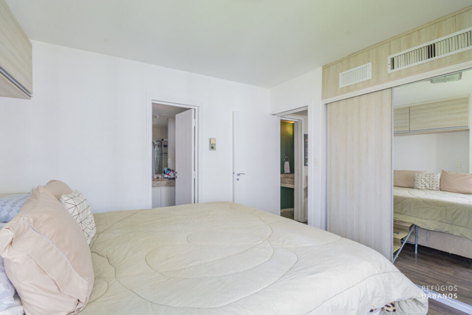 Seguindo para a área íntima, temos a suíte. Aqui, espaço é o que não falta, pois temos armários embutidos e conta com um banheiro super amplo com chuveiro a gás.