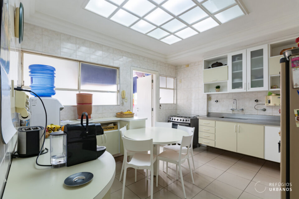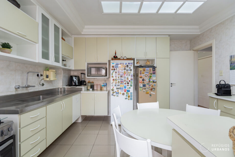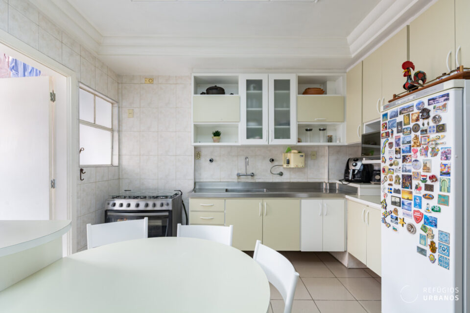 Em seguida, a cozinha tem um ótimo tamanho e conta com armários embutidos e muito espaço, facilitando uma reconfiguração, caso seja o desejo do novo morador.