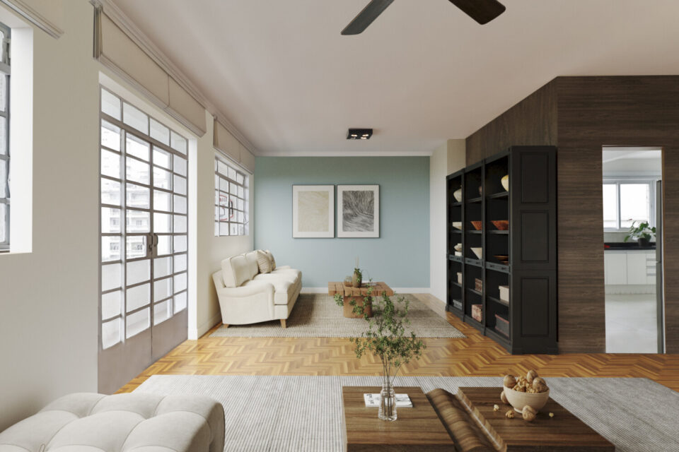 A partir disso, temos um amplo living, com 3 ambientes: sala de tv, living e sala de jantar. Além da varanda, tem janelão em toda a lateral da sala.