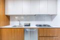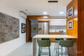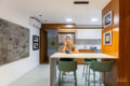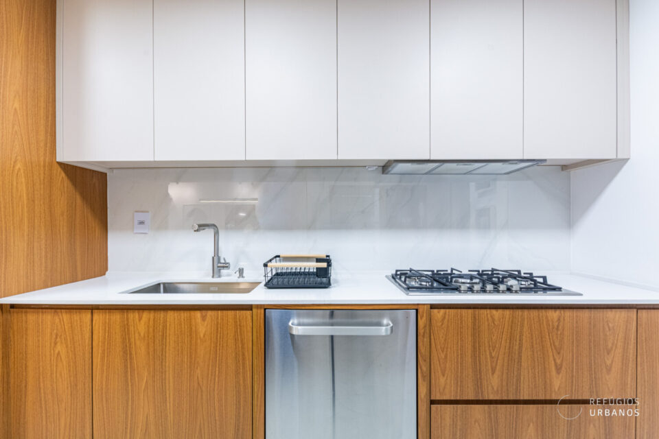 A cozinha é espaçosa e iluminada e possui marcenaria planejada. A bancada que divide o ambiente está ali para refeições rápidas e praticidade do dia a dia. Vale ressaltar que ela será entregue com todos esses equipamentos: forno, microondas, depurador e cooktop.