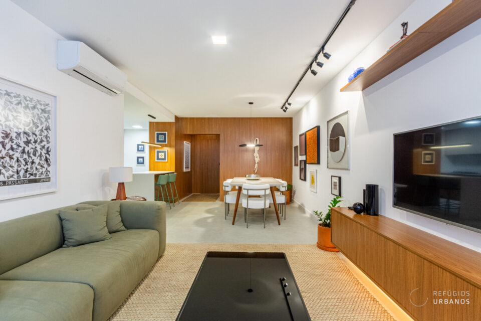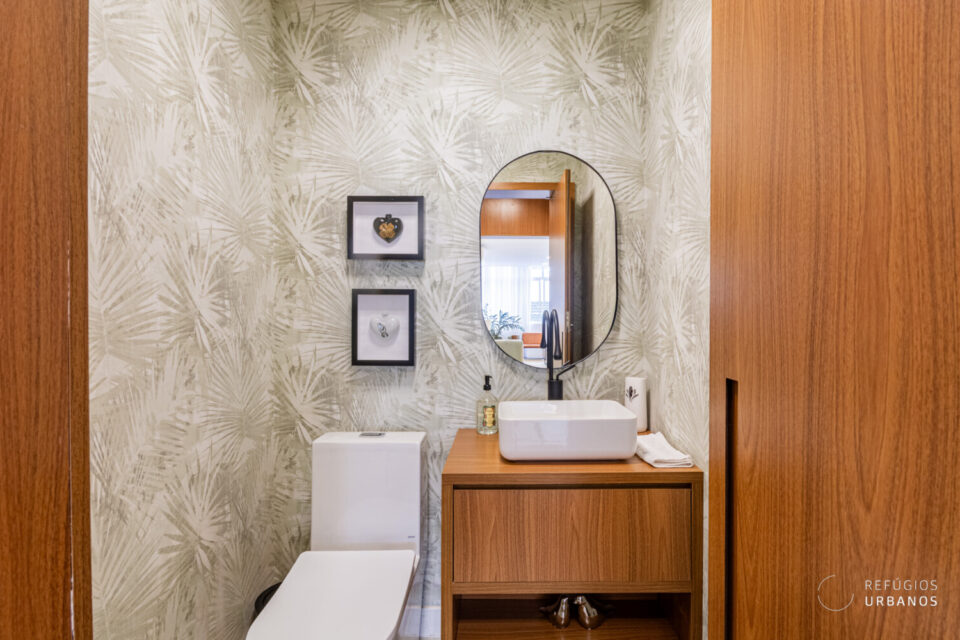 O living, iluminado, espaçoso e com boa janela, comporta dois ambientes tranquilamente: tem sala de TV e sala de jantar, bem confortável para receber convidados. O apartamento possui um lavabo logo na entrada, que nos surpreende pela sua modernização e acabamentos.