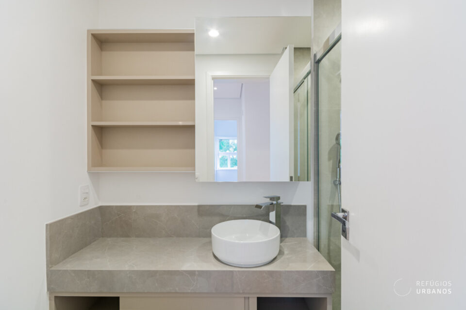 Seguindo para a área íntima, contamos com três quartos, sendo uma suíte especial do casal, com um banheiro pra lá de charmoso.