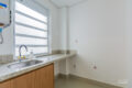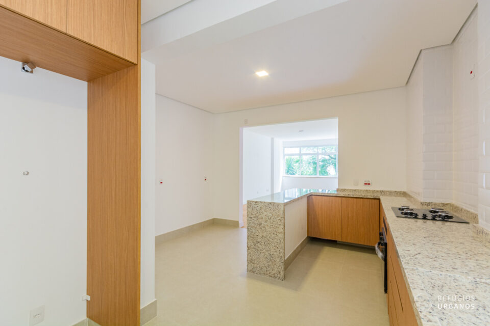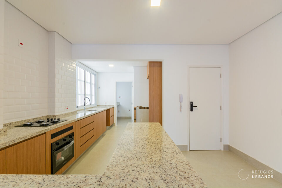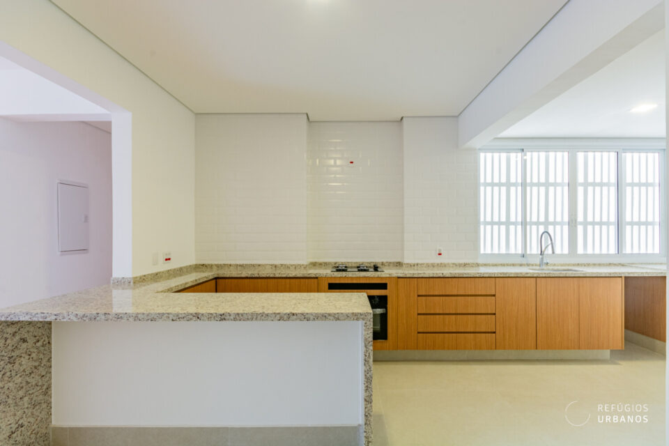 A cozinha integrada é muito espaçosa e iluminada e com muita marcenaria planejada. Além de um espaço que comporta uma despensa completa! E como é um ambiente com janelas, a ventilação está garantida. E os detalhes da bancada e os elementos escolhidos? Lindos! Ainda contamos com ponto para lava louças, cooktop e forno já instalados!