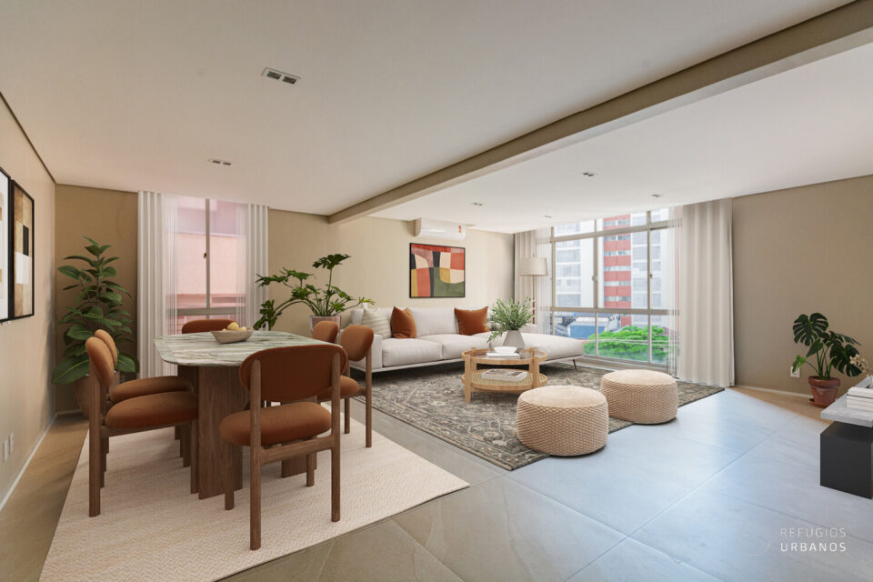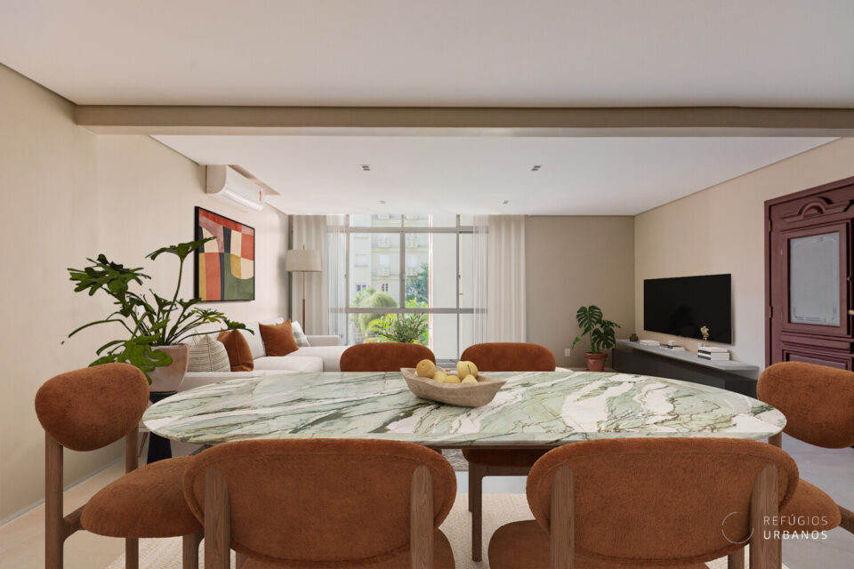 O antigo terceiro quarto foi aberto para a sala, e não à toa ganhamos um espaço perfeito para a sala de jantar e receber a família ou os amigos para aquele momento especial. Em outras palavras, um apartamento perfeito para quem gosta de confraternizar.