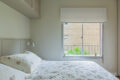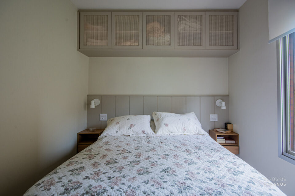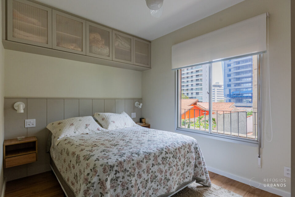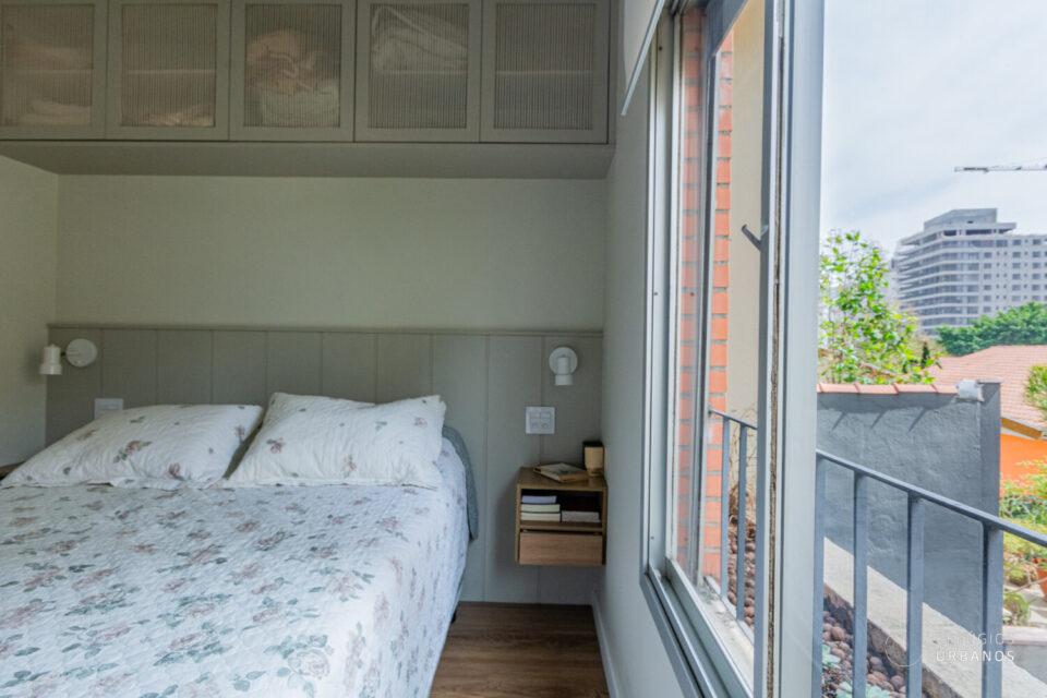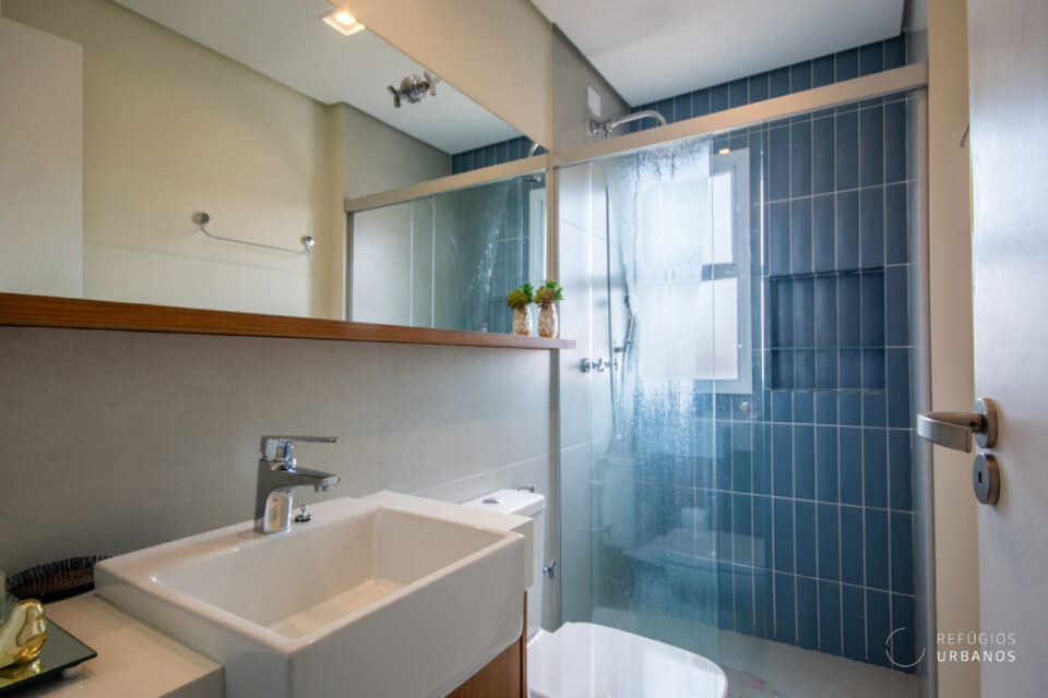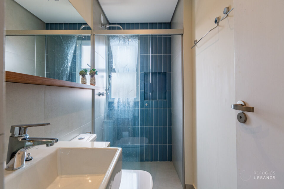 Atualmente, temos um quarto único, que conta com um janelão e iluminação natural, além da marcenaria charmosa e de alto padrão e nada menos que um banheiro lindo, que complementa esse contexto de modernidade e atemporalidade, usando o azul como pano de fundo. E, além do mais, conta ventilação natural.