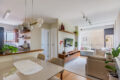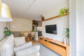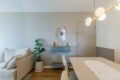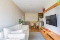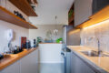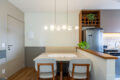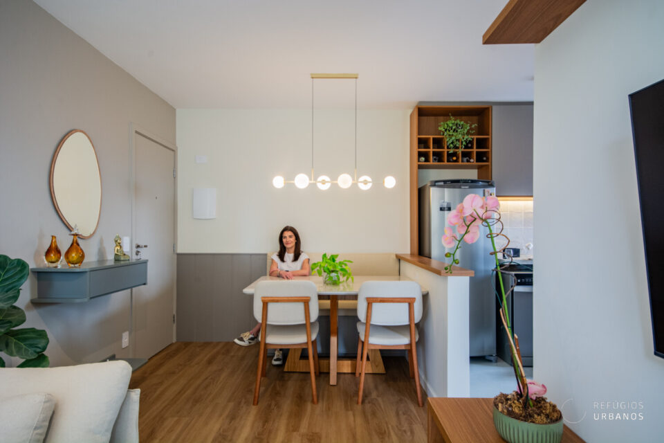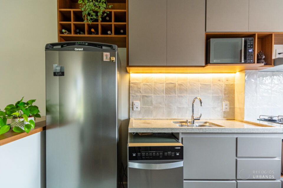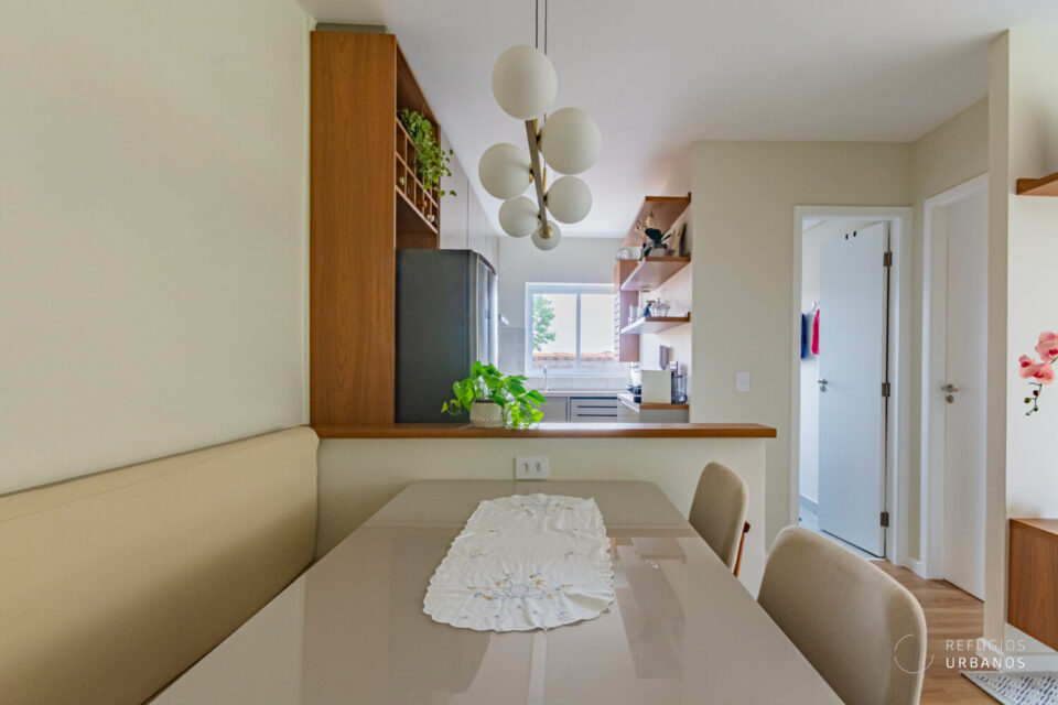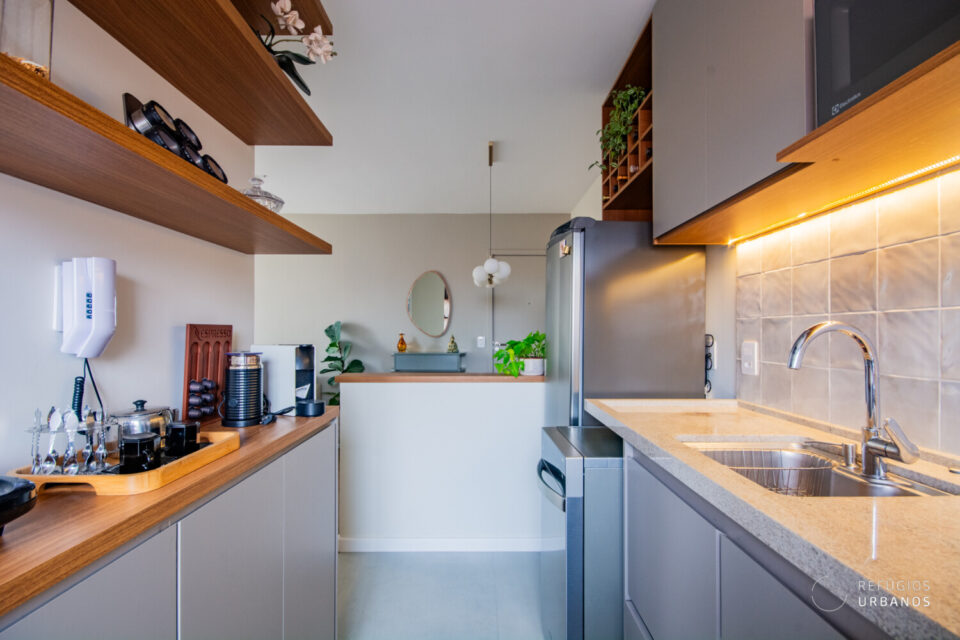 A partir disso, temos a cozinha aberta, também com uma janela generosa, com vista para a lateral do condomínio. Igualmente, contamos com uma linda marcenaria, e projeto de iluminação.