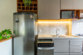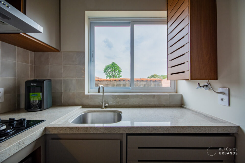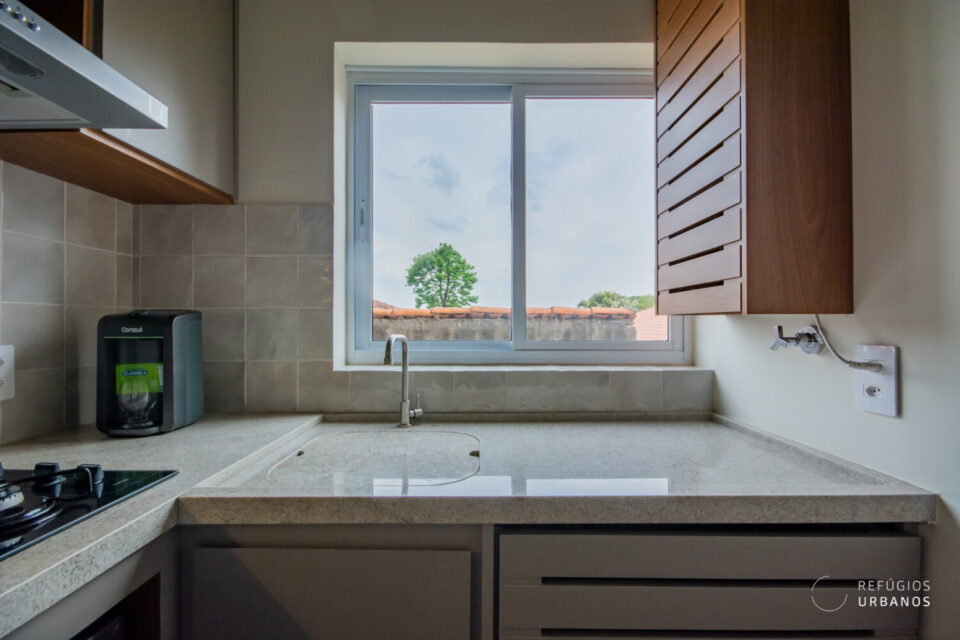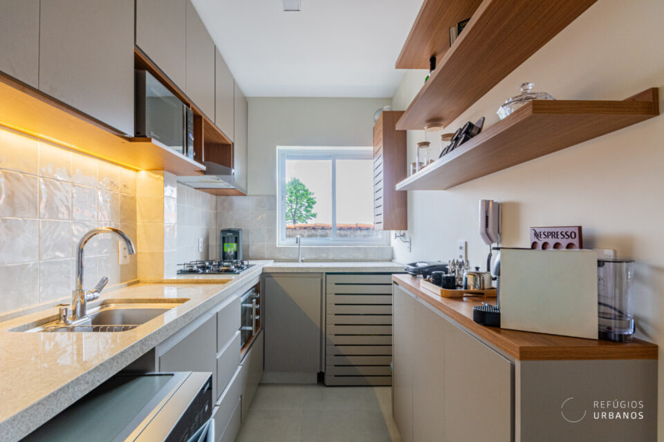 A cozinha, por sua vez, é integrada e iluminada também dispondo de fogão e a coifa que já embutidos, bem como o espaço para a máquina de lavar louça e uma marcenaria que embute e esconde a máquina de lavar roupa.