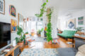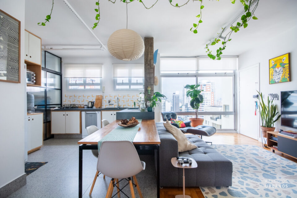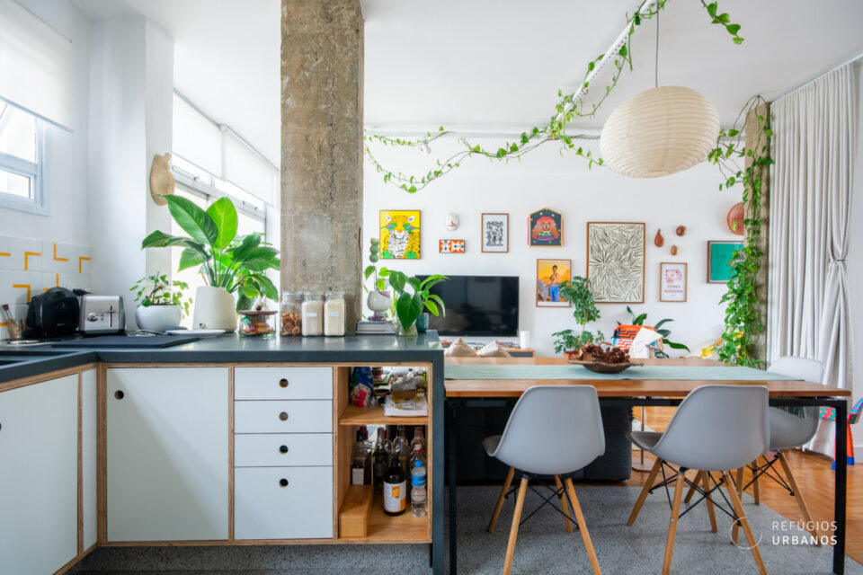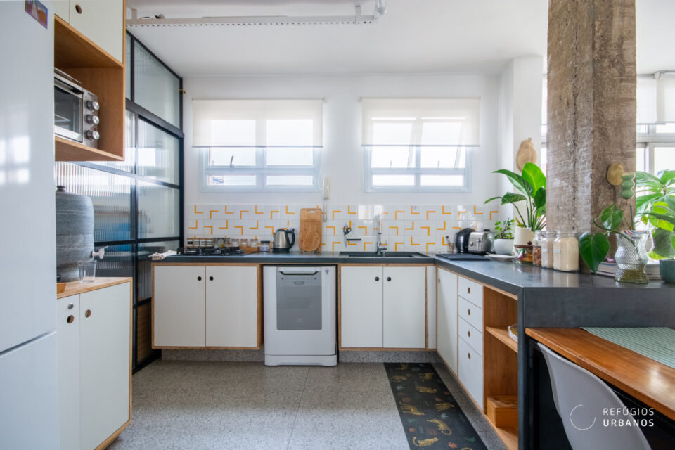 O apê está totalmente reformado e é a cara de Pinheiros, a começar pela cozinha estilosa com bancada em ardósia, marcenária em fórmica e os azulejos em tons amarelos da Lurca.