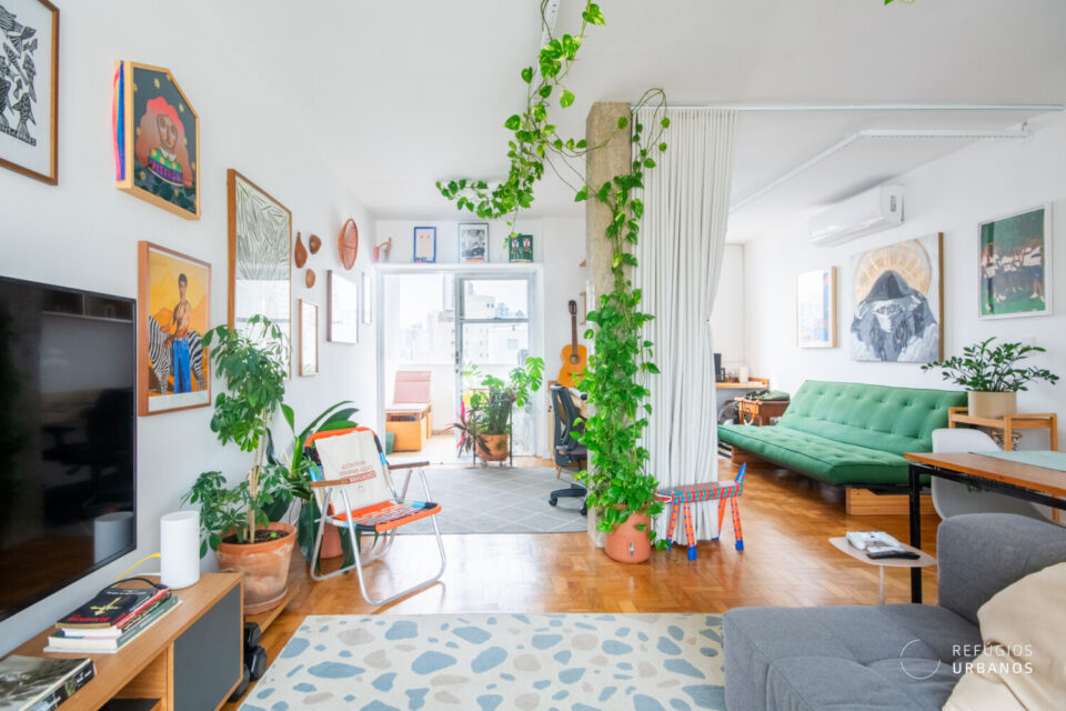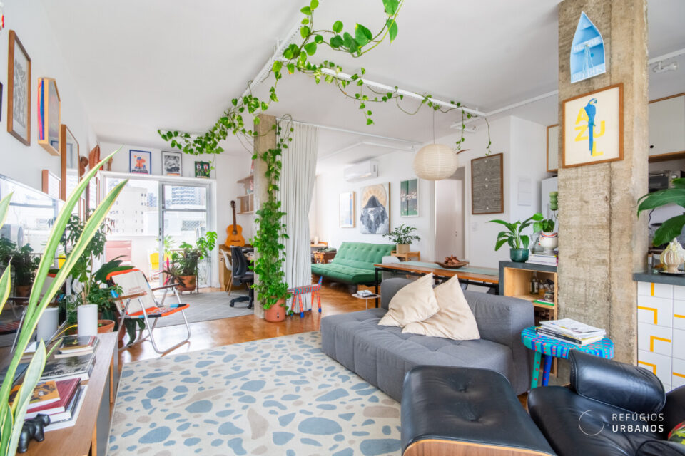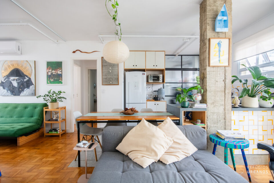 O living é super confortável, integrado tanto com a cozinha como com o segundo dormitório que está semiaberto.