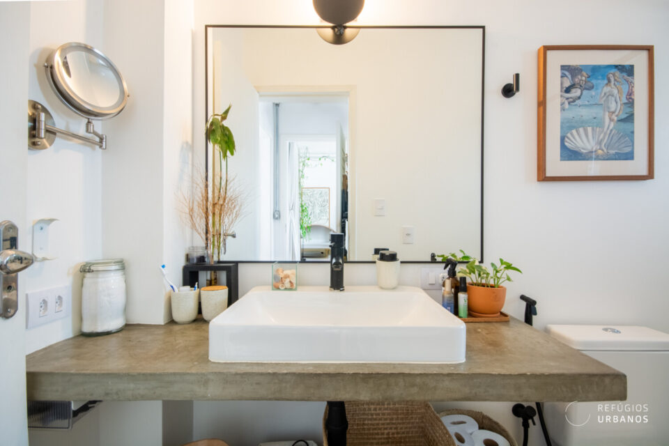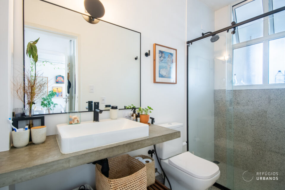 Os armários já estão embutidos e o banheiro na mesma estética da reforma, com bancada em concreto, ventilação natural e o aquecimento é à gás :)