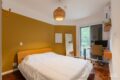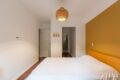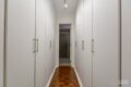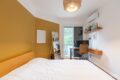 O corredor distribui bem os ambientes. Primeiro, um quarto espaçoso e iluminado, com marcenaria sob medida. Ao lado, um banheiro social completo atende com praticidade.