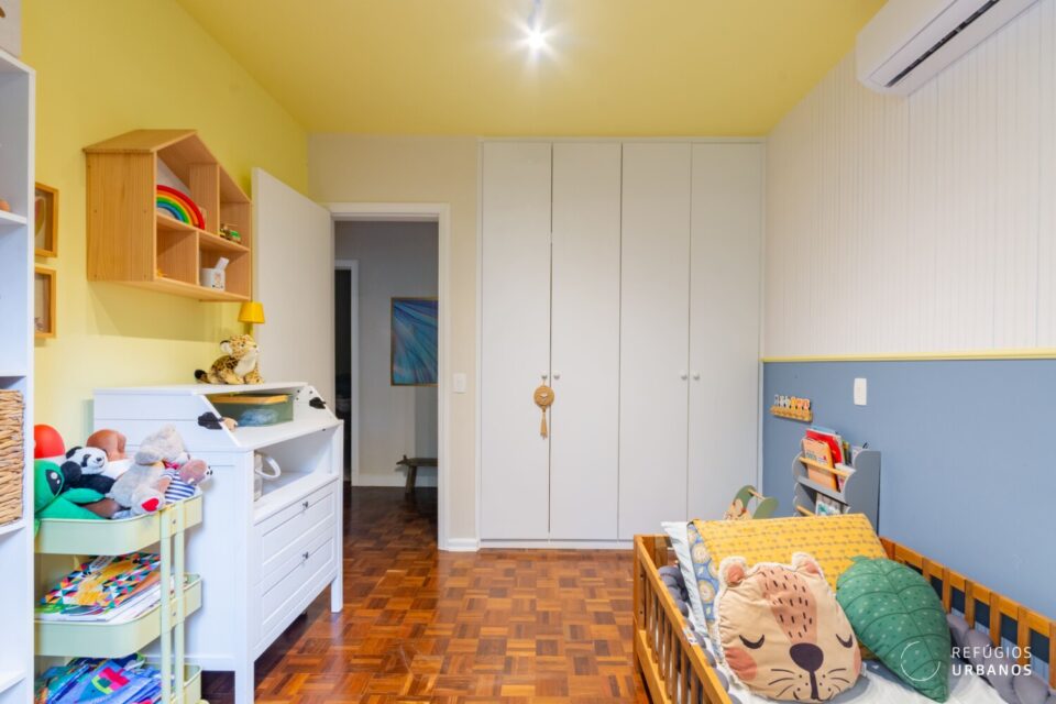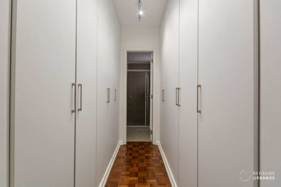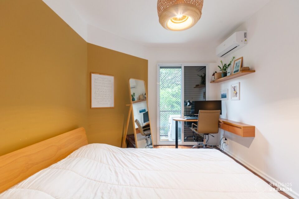 Em seguida, a suíte surpreende. Ela é ampla, possui closet e marcenaria de ótima qualidade. O sol da tarde também abraça esse espaço, criando uma atmosfera acolhedora no fim do dia.
