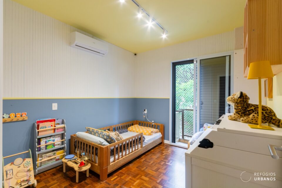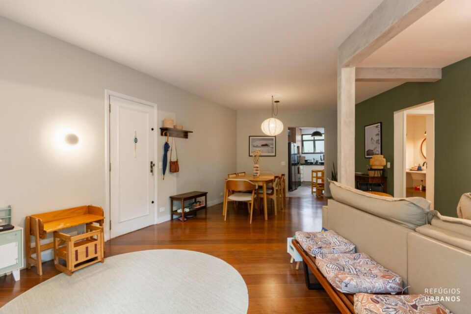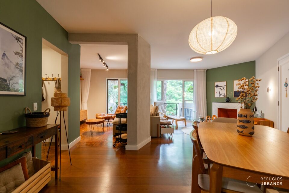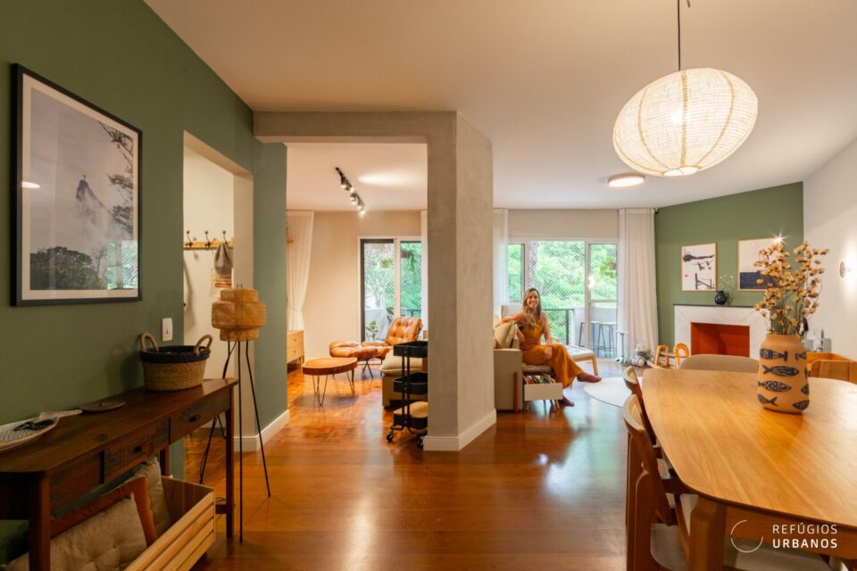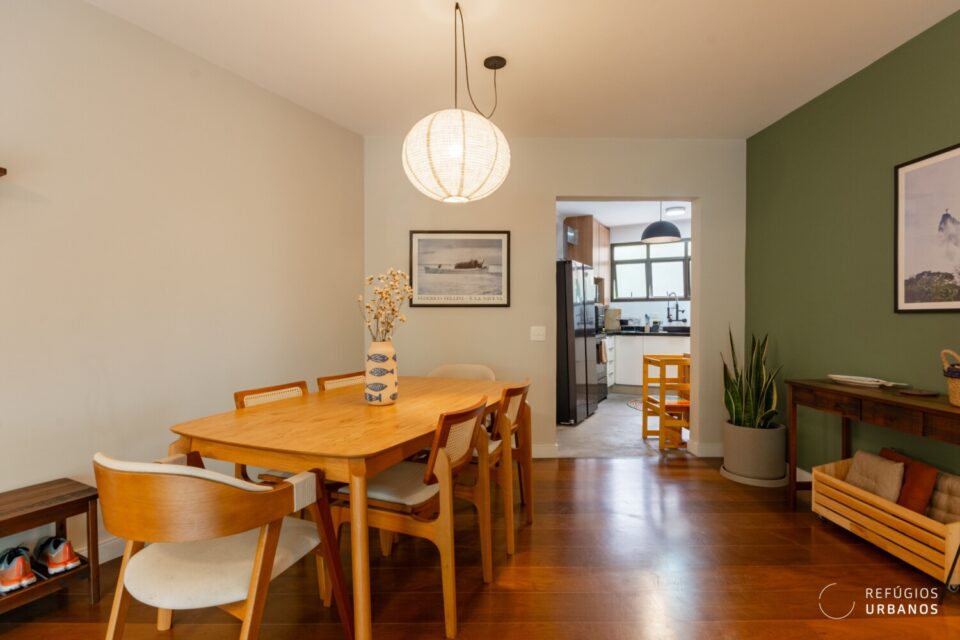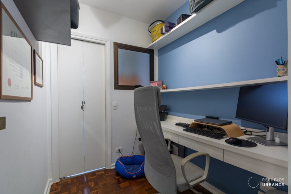 A integração com a cozinha aconteceu de forma sutil. Assim, os ambientes conversam, mas cada um mantém sua identidade. O antigo quarto de apoio virou escritório, solução perfeita para quem trabalha em casa.