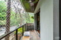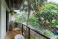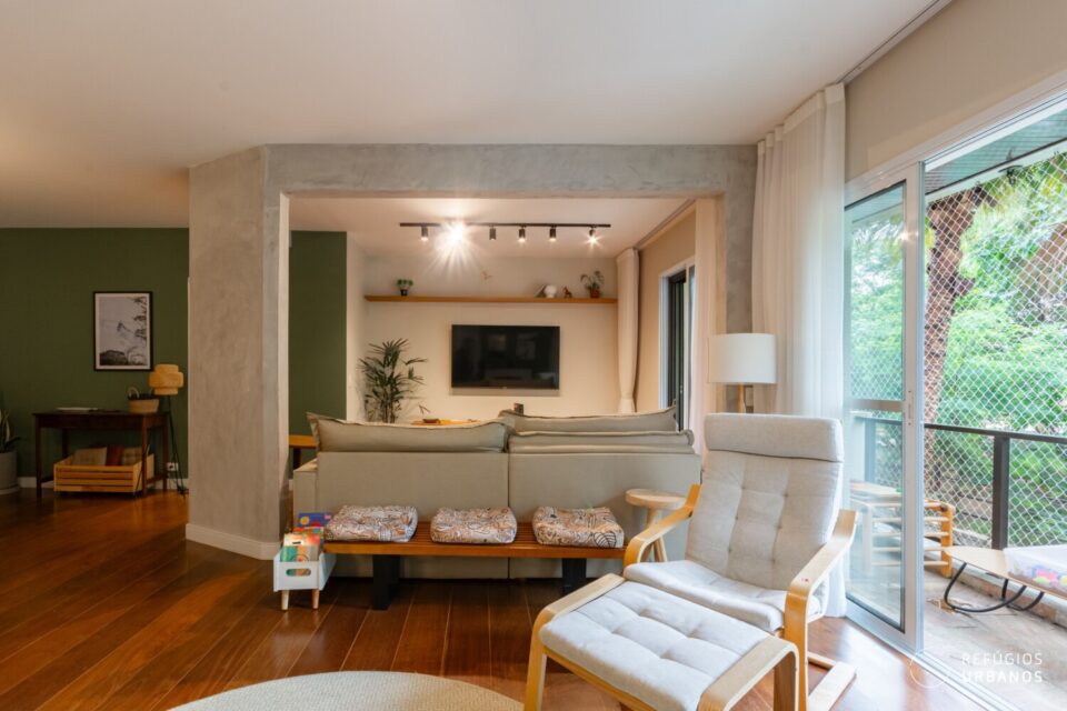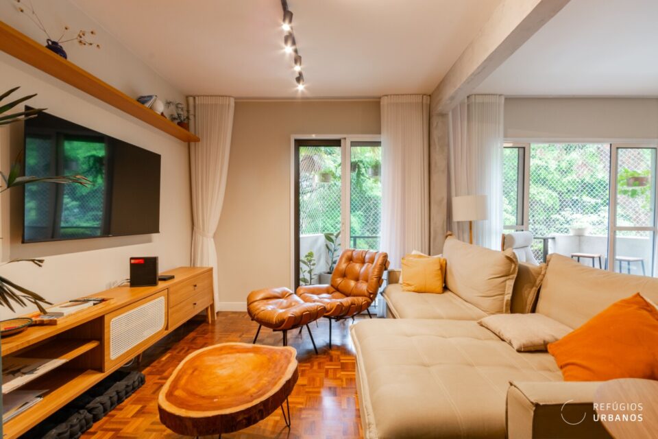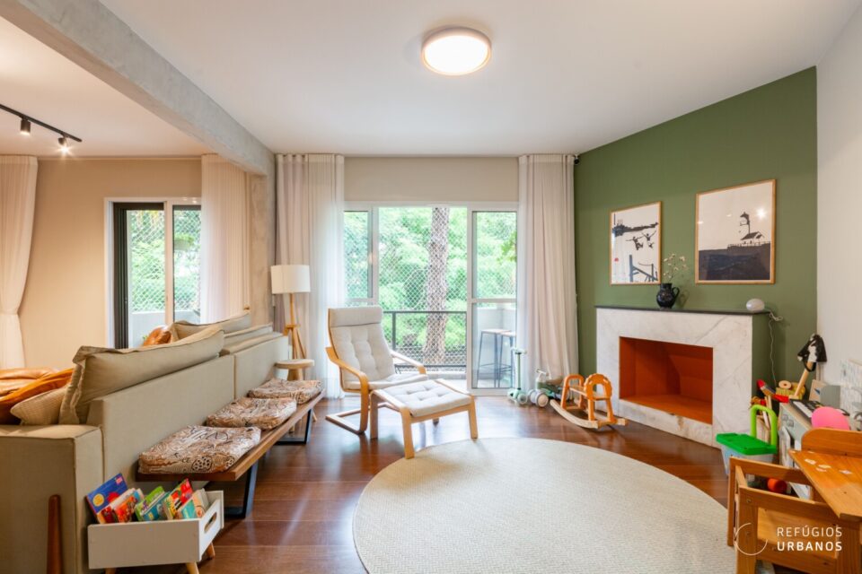 Estamos no primeiro andar. No entanto, a sensação é de estar suspenso no verde. A sala recebe o sol da tarde, que entra generoso pelas janelas e aquece o piso. Além disso, a varanda se abre para uma grande árvore, presente vivo da praça logo em frente.