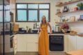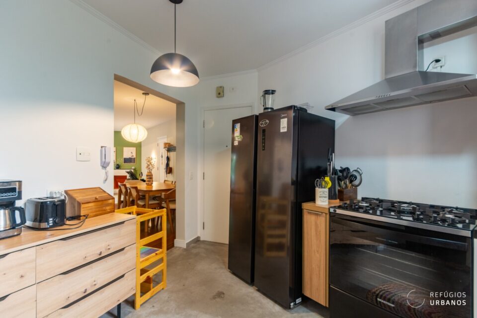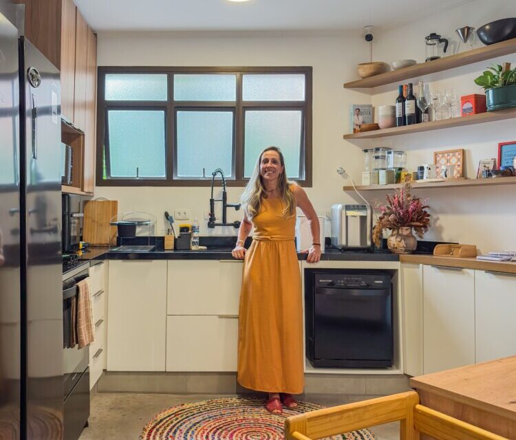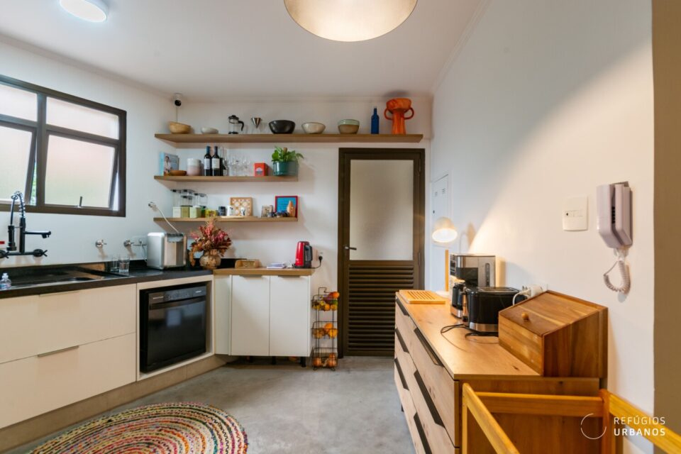 A cozinha recebe luz natural e ventilação direta da janela da área de serviço. Com a reforma, os ambientes se aproximaram, o que trouxe mais fluidez ao dia a dia.