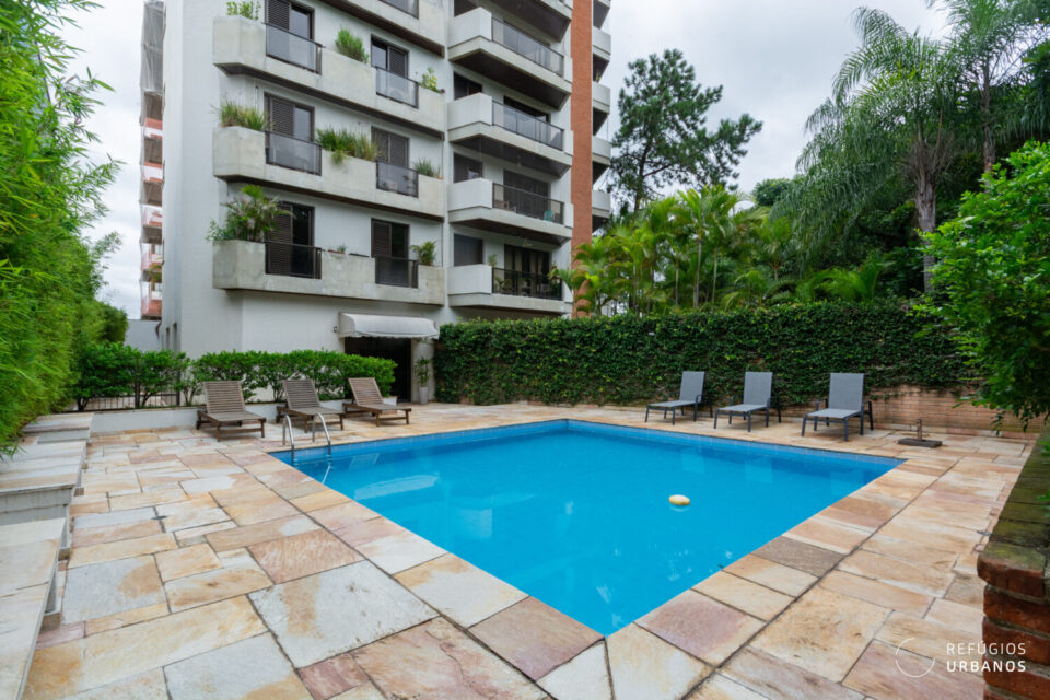 Apartamento na Vila Madalena, em frente a Praça Comendador Manuel de Melo Pimenta, com 125m² úteis, 2 quartos sendo 1 suíte, 2 vagas fixas, portaria 24h e lazer com piscina, sauna, salão de festas e churrasqueira. Reformado, varanda com vista verde e sol da tarde.