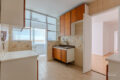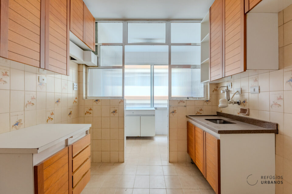 E, por fim, a cozinha, que pode ser aberta para o living e com uma área de serviço generosa. Do mesmo modo, conta com o janelão que percorre todos os ambientes desse apartamento.