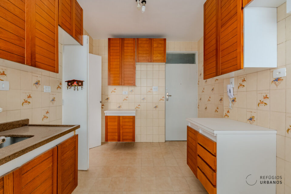 A cozinha é retangular e iluminada, e além da generosa área de serviço, um bom quarto de apoio e banheiro.