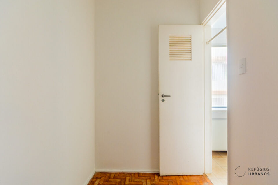 Atualmente, são três quartos. A suíte principal, assim como a sala, conta com um janelão e boa iluminação natural, além de um banheiro com ventilação natural.
