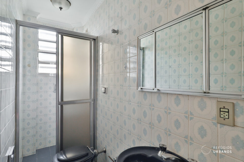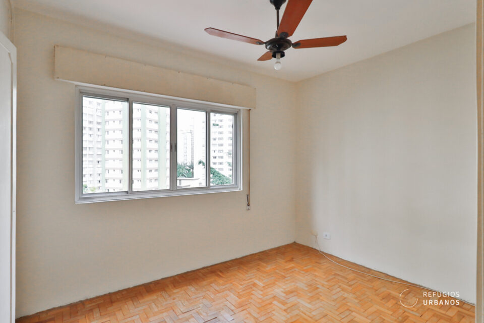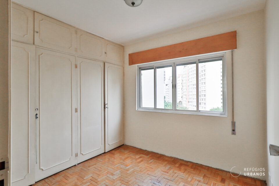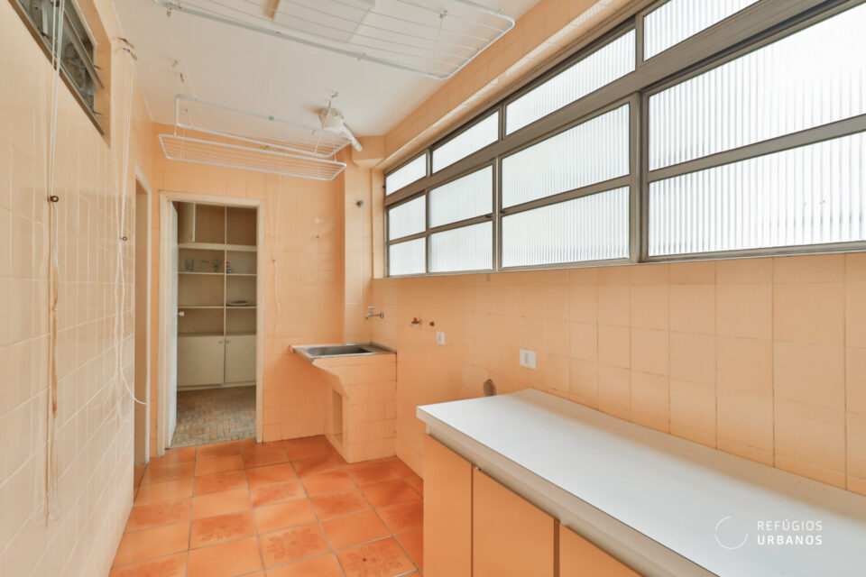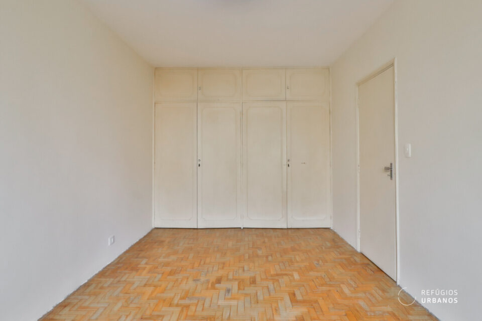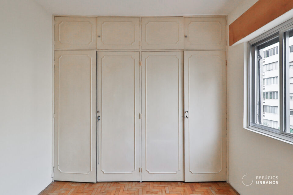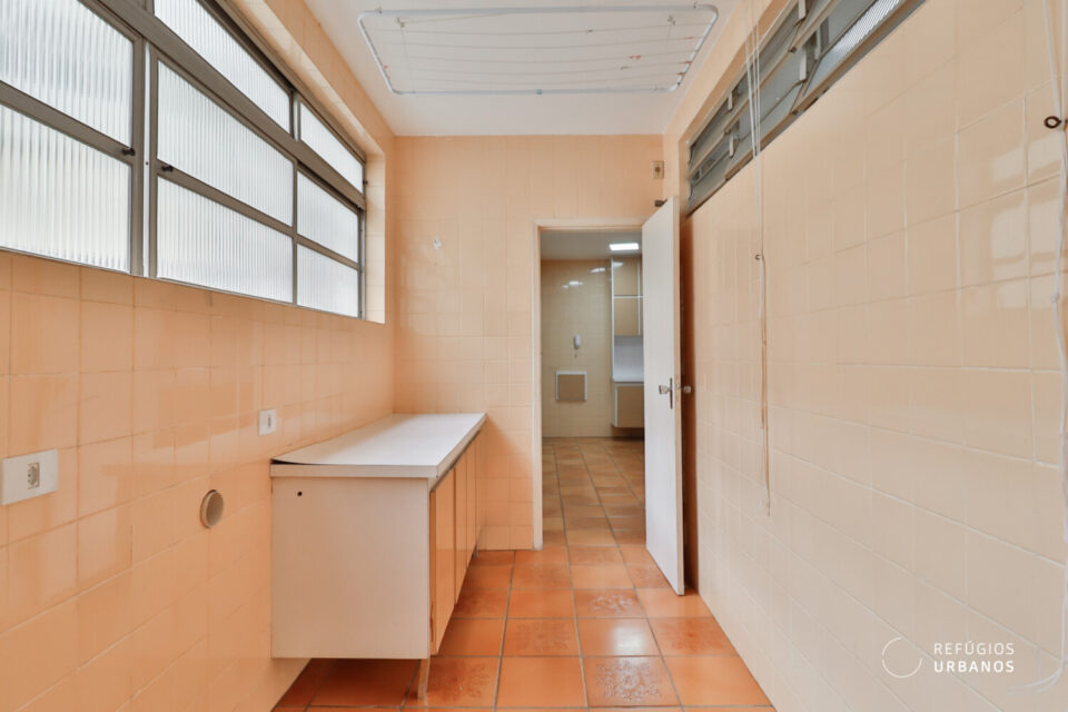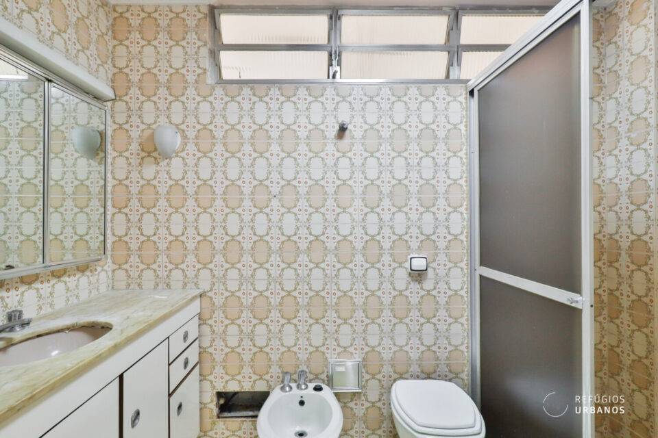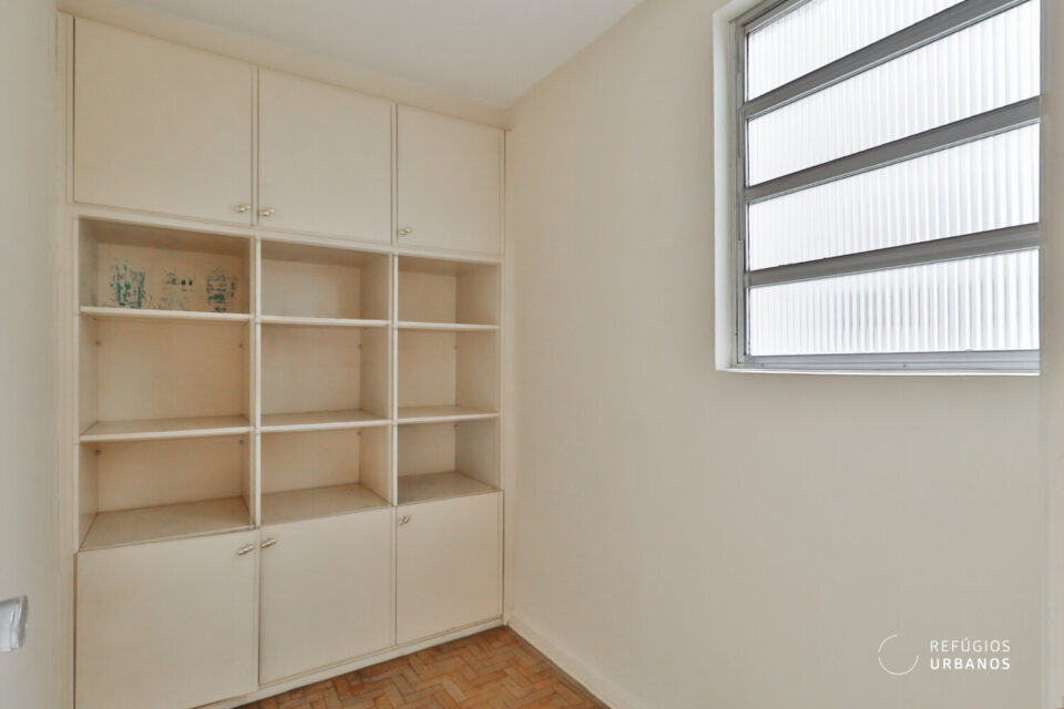 Os ambientes são bem iluminados e ventilados — característica marcante da arquitetura da época —, o que, inclusive, facilita projetos de integração e, além disso, valoriza qualquer intervenção. Entre as possibilidades mais interessantes estão: transformar um dos dormitórios em suíte com closet, aproveitando o banheiro de apoio e o quarto de serviços da lavanderia; integrar a cozinha à sala; e, ainda, instalar aparelhos de ar-condicionado (o prédio, por sua vez, adequou recentemente a rede elétrica).