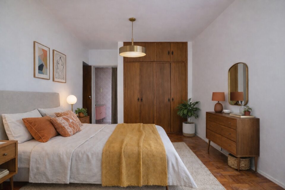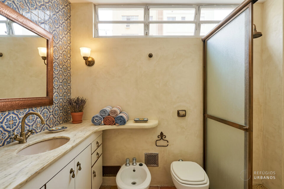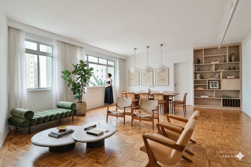 Os ambientes são bem iluminados e ventilados, característica marcante da arquitetura da época, o que, inclusive facilita projetos de integração e, além disso, valoriza qualquer intervenção. Entre as possibilidades mais interessantes estão: transformar um dos dormitórios em suíte com closet, aproveitando o banheiro de apoio e o quarto de serviços da lavanderia; integrar a cozinha à sala, e, ainda, instalar aparelhos de ar-condicionado (o prédio, por sua vez, adequou recentemente a rede elétrica).