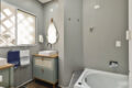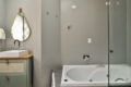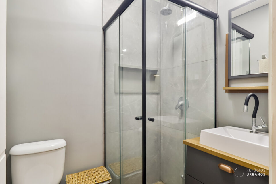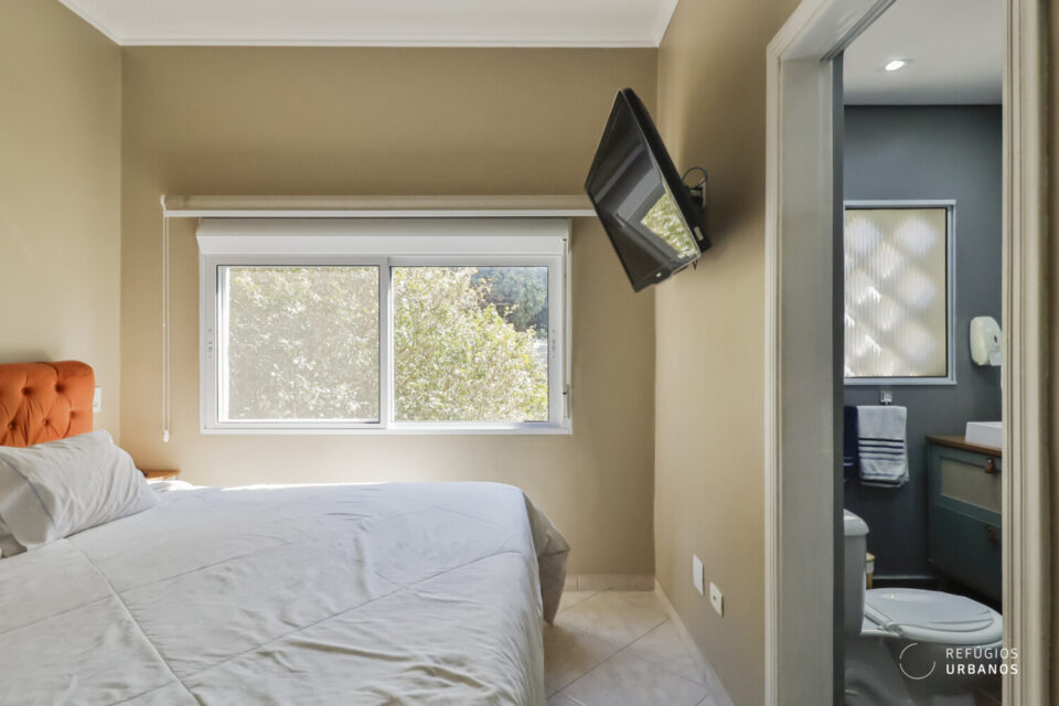 A suíte master surpreende com um walk-in-closet, que amplia a sensação de organização. No banheiro, o conforto está em cada detalhe: a hidromassagem convida ao relaxamento após um longo dia, enquanto as duas cubas de pia oferecem independência ao casal, sem abrir mão da personalização.