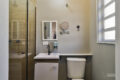 Em seguida, um corredor nos leva à área íntima, e antes de chegarmos aos quartos, encontramos um banheiro social, ideal para atender um dos dormitórios ou receber visitas com conforto.