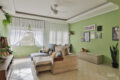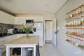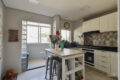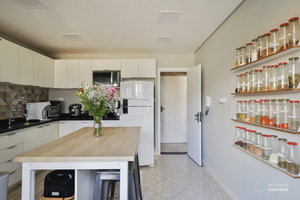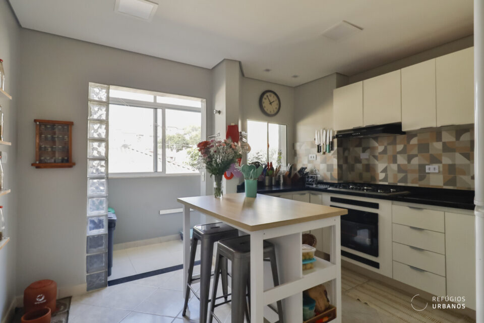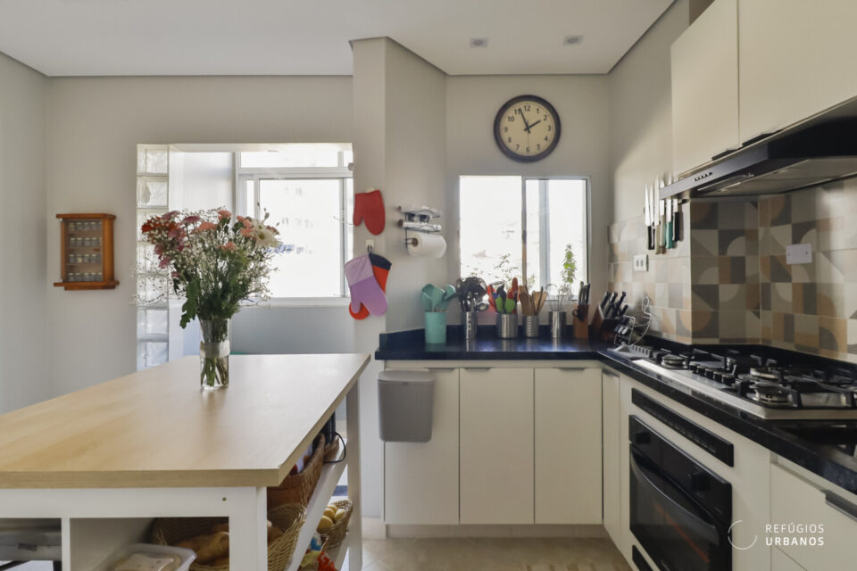 A cozinha recém reformada ganhou traços afetivos e foi semi integrada à lavanderia, que agora também pode se beneficiar do janelão responsável por iluminar o ambiente com luz natural ao longo do dia.