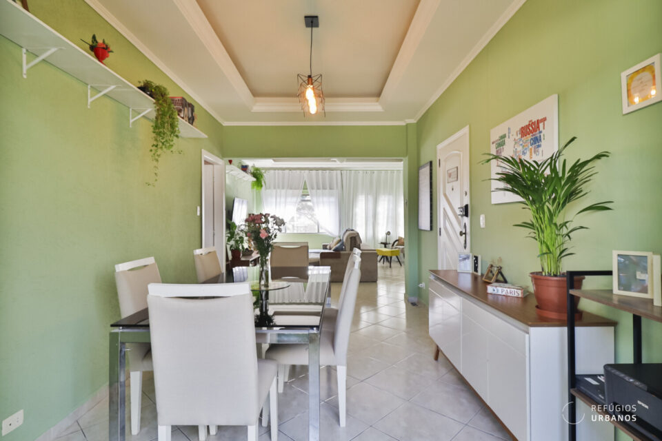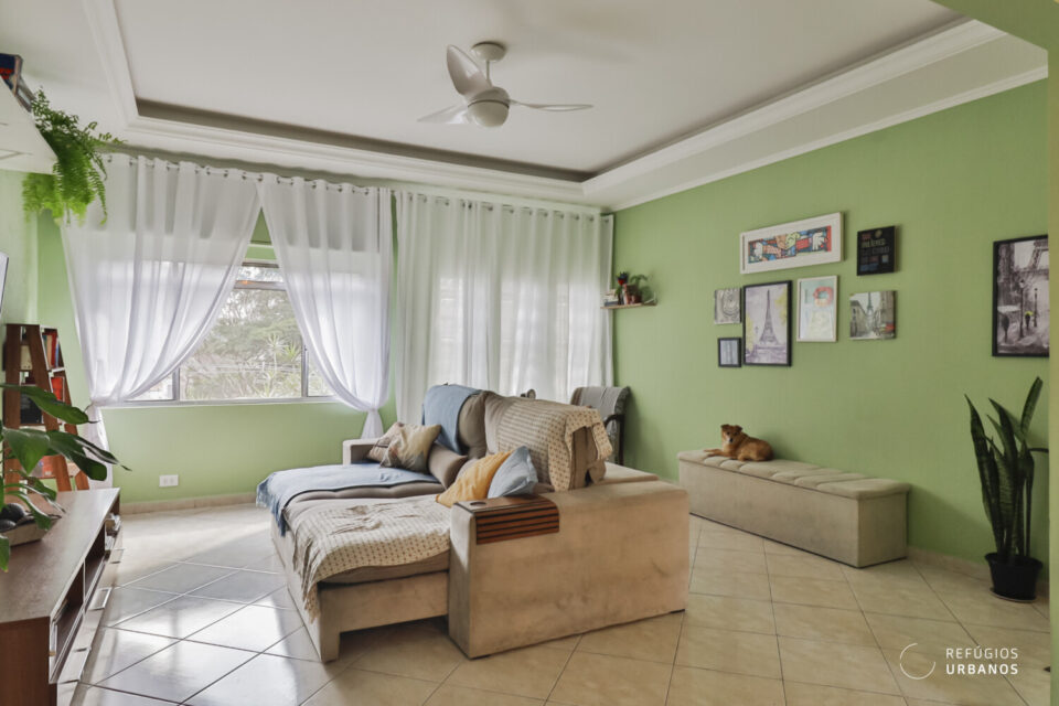 Estamos localizados em um andar confortável, onde se permite ter o privilegio de uma vista verde. Ao entrar, temos um living amplo e iluminado que permite a fluidez de três ambientes : sala de TV, espaço de leitura e jantar. Um cenário perfeito para momentos de lazer quanto para encontros especiais.