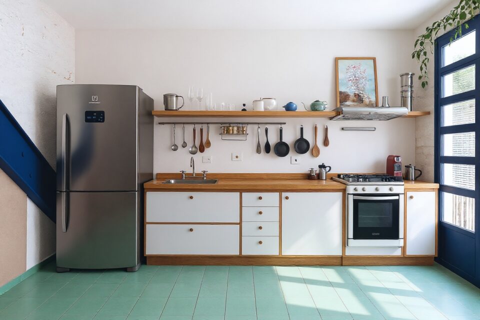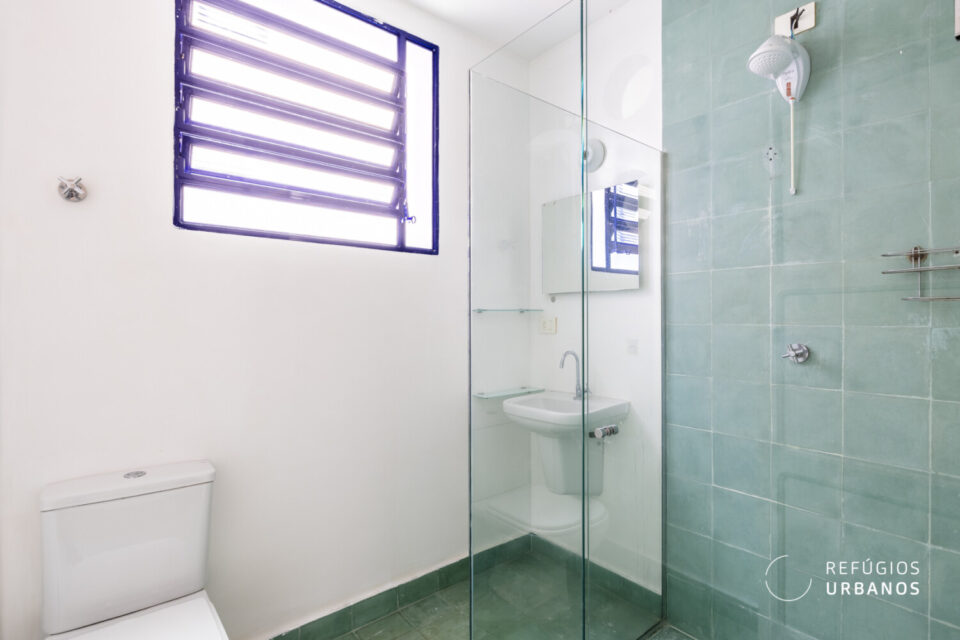 A reforma, comandada pela Vapor Arquitetura, integrou os ambientes sociais, reforçou vigas e colunas, e apostou em materiais e soluções cheias de personalidade, como é o caso do piso em Tauari, ladrilhos coloridos e janelas redondas, que trazem luz natural e um toque lúdico ao banheiro.