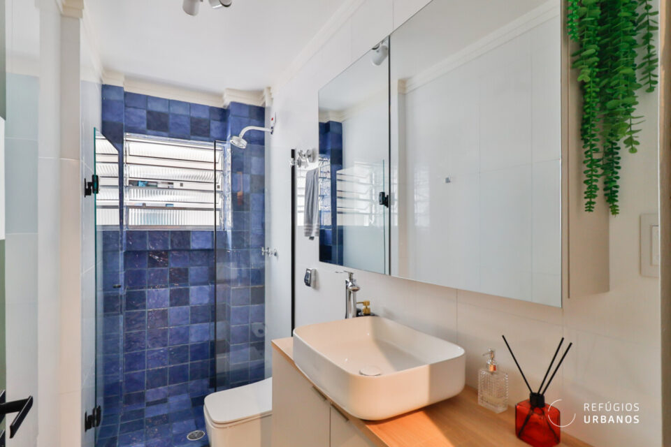 Os dois quartos são generosos e oferecem o repouso que uma rotina intensa merece. Um banheiro completo, estrategicamente posicionado entre eles, atende a ambos com elegância e praticidade.