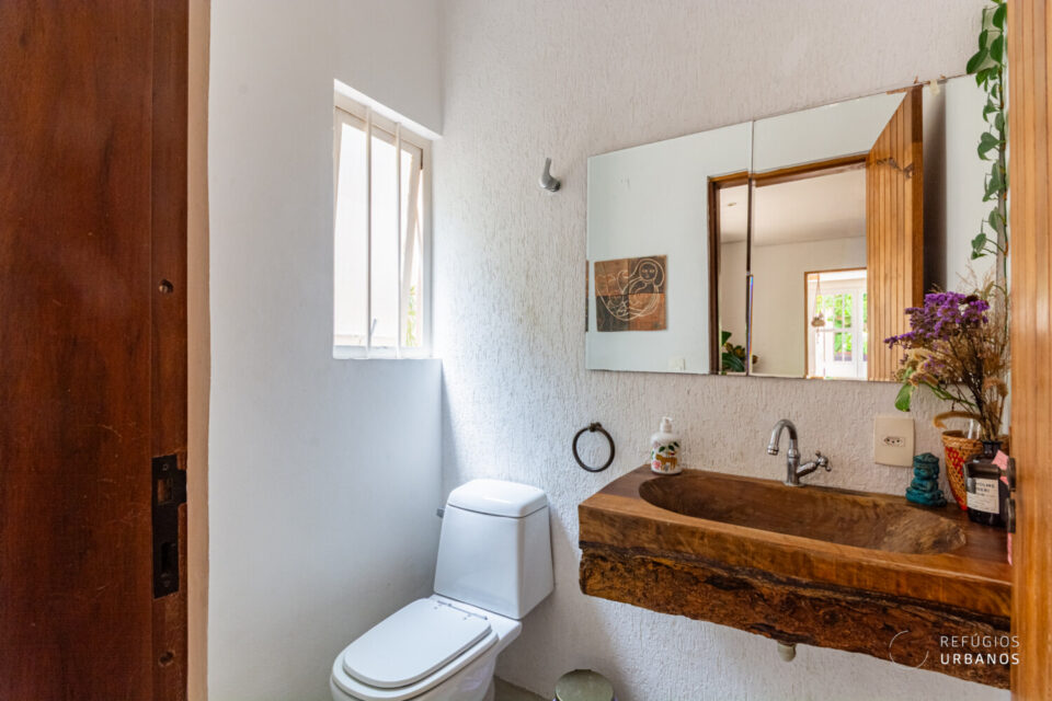Aqui, há um marcante piso de tacos e a sala de estar no entorno da lareira. Ou seja, essa é uma casa muito aconchegante. Um lavabo atende as visitas no mesmo andar com uma bela pia feita em madeira