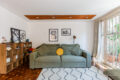 Uma sala íntima fica entre os dois quartos. Assim como em todos os cômodos, as janelas de madeira maciça são grandes, o pé direito é alto e o piso de madeira garante conforto.
