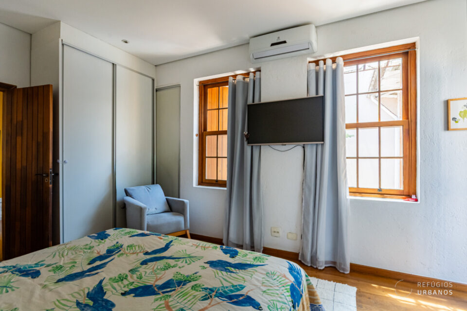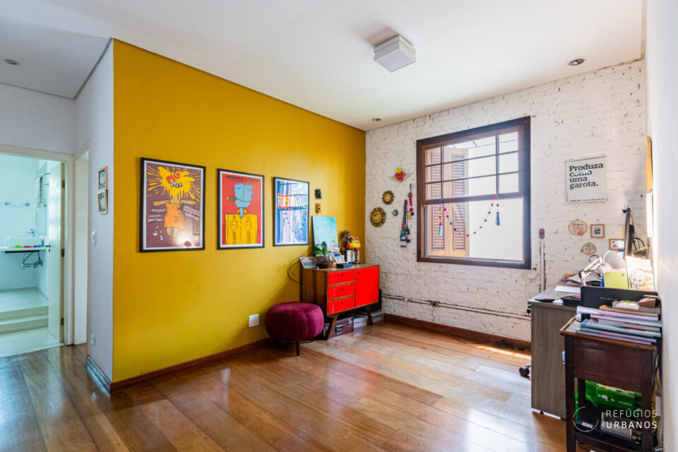 Um dos dormitórios está localizado no pavimento térreo, com entrada pela área externa. Atualmente utilizado como quarto de visitas, é um excelente escritório. Um detalhe interessante é o piso de cimento com entalhes em madeira.