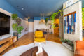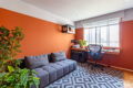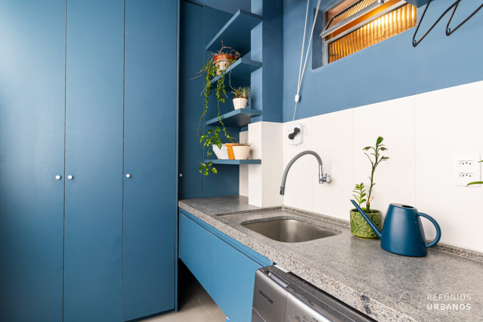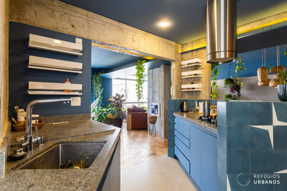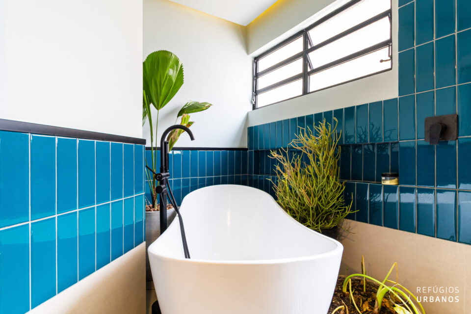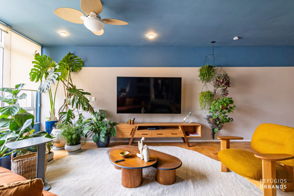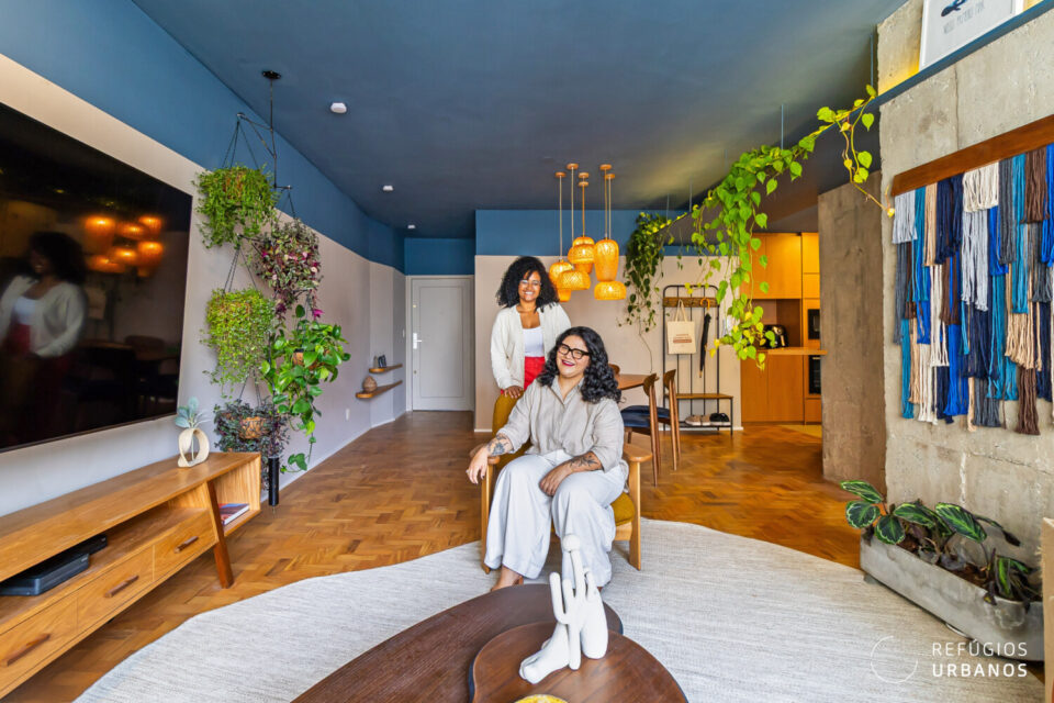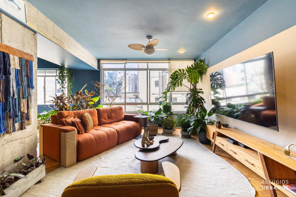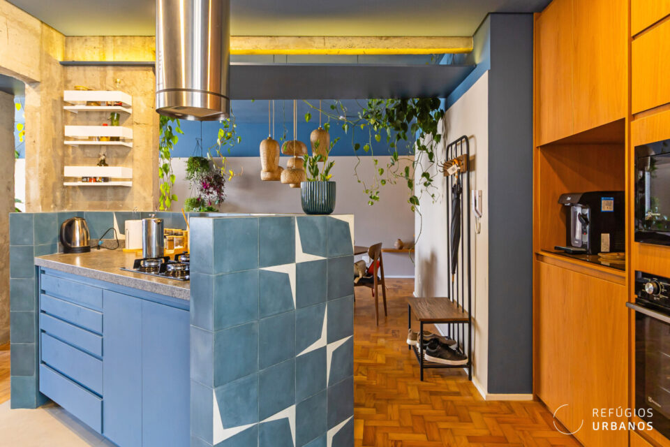 Além disso, cada cor, textura e detalhes desse apartamento foi escolhido com cuidado, pensando em criar uma atmosfera harmoniosa e cheia de personalidade: piso de taco restaurado, ladrilho hidráulico na bancada da cozinha e no nicho da sala, um baita janelão com iluminação natural, cores e muitas plantas!