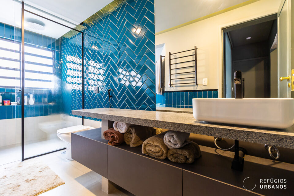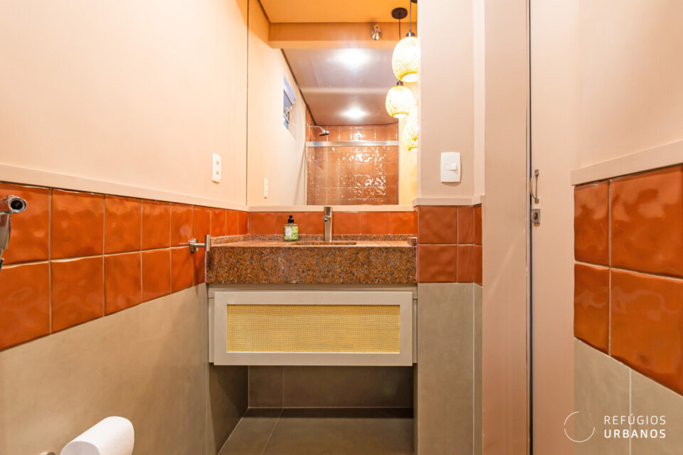 No corredor, antes de chegarmos à suíte, temos um banheiro de apoio, que dispõe de chuveiro a gás, lavatório com marcenaria, e um nicho dentro do box do banheiro, para mais praticidade no dia a dia.