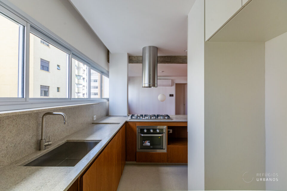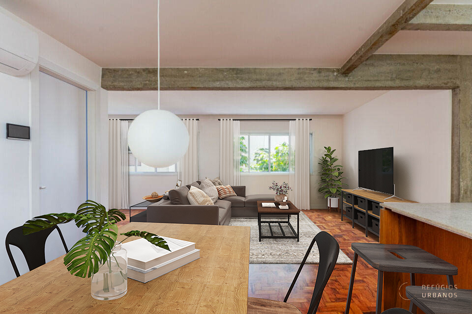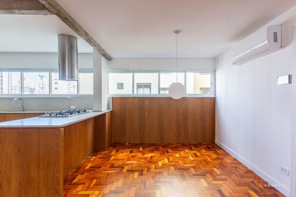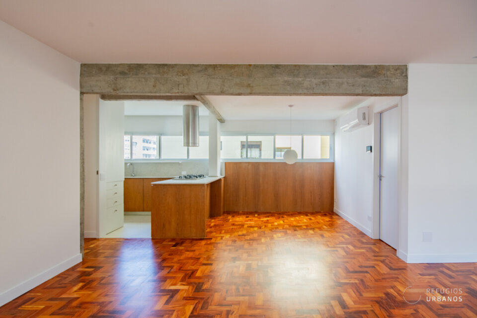 Este elegante apartamento no coração do Jardim Paulista passou por reforma total, unindo, desse modo, um projeto moderno e contemporâneo a elementos industriais, como as vigas aparentes, que conferem personalidade e estilo ao espaço.