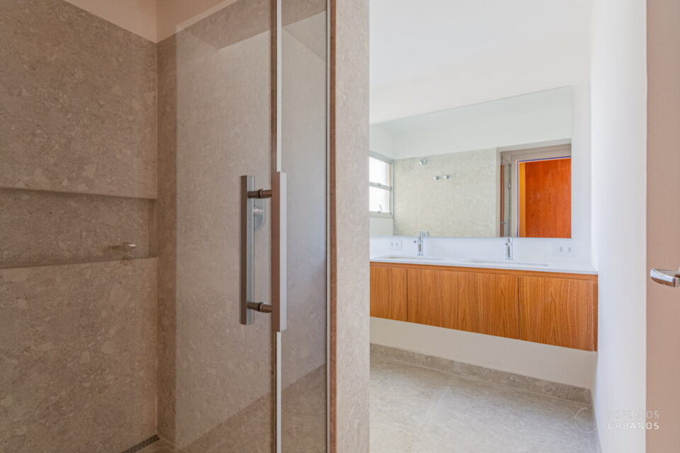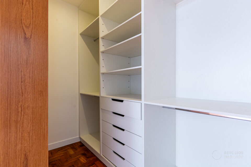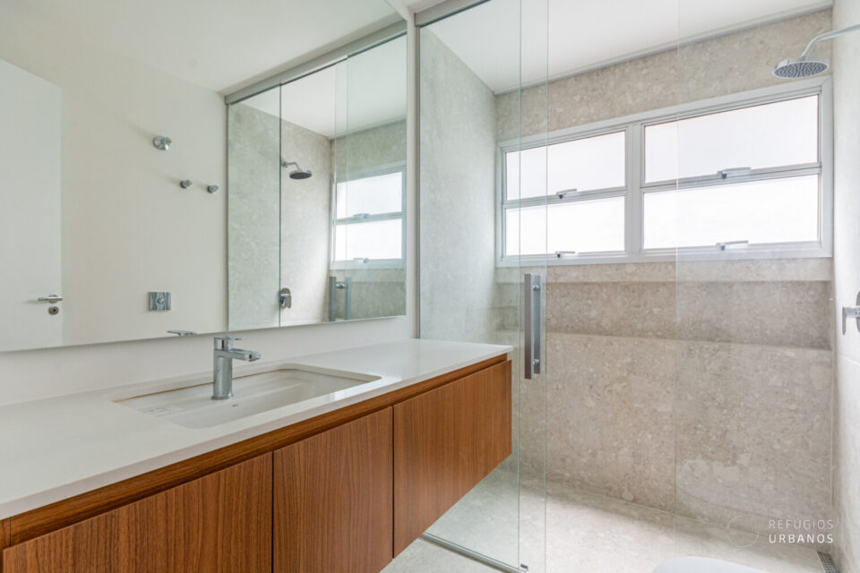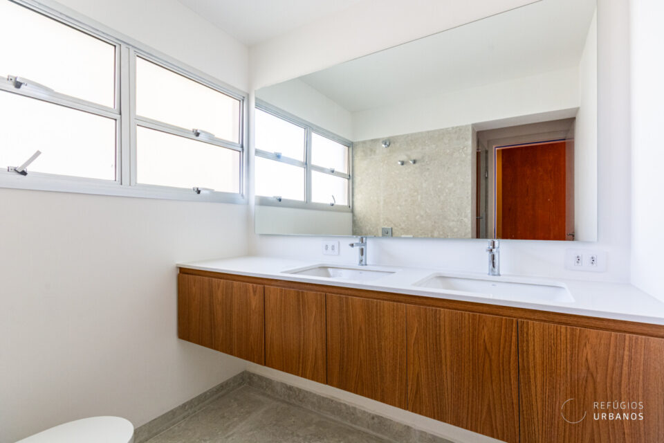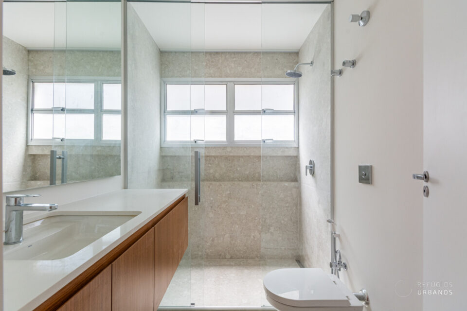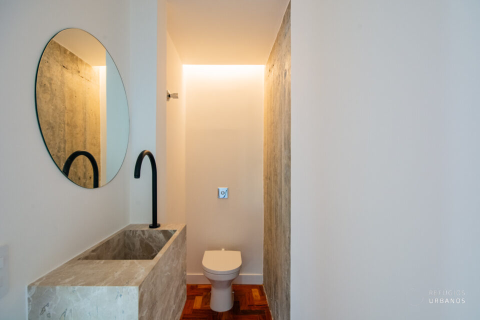 O apartamento também dispõe de um lavabo, perfeito para receber visitas, além de acabamentos de alto padrão, marcenaria sob medida e uma paleta de cores neutra e sofisticada.