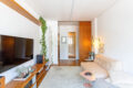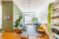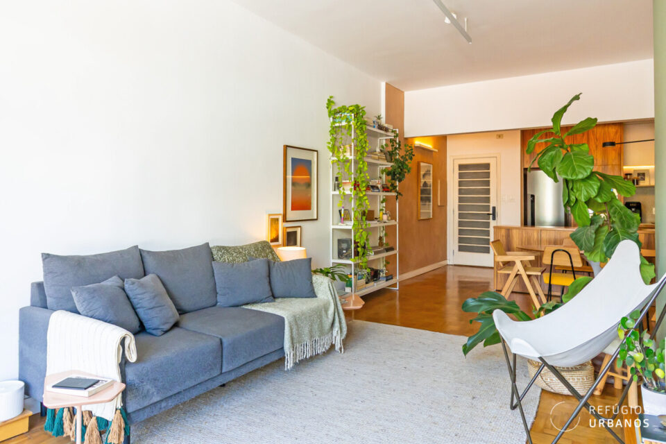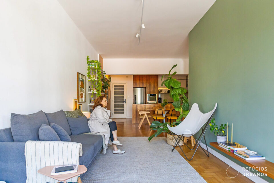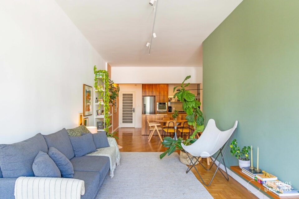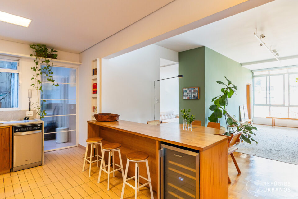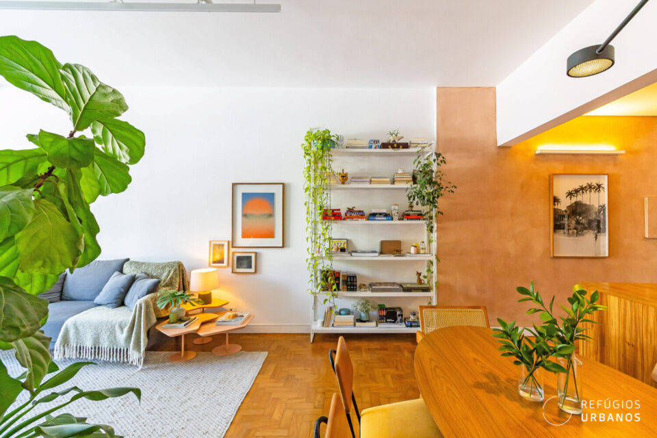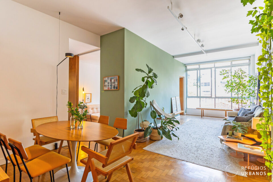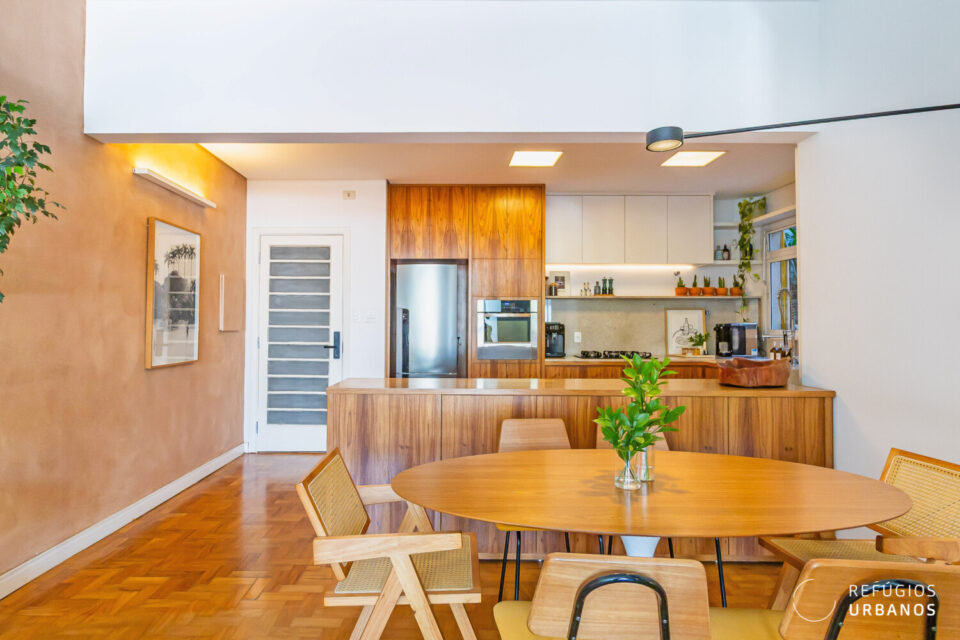 O layout valoriza a convivência: de um lado, a sala de estar; de outro, a de jantar, ambas voltadas para janelões de piso ao teto que enquadram uma vista livre para o Pacaembu um convite diário para desacelerar.