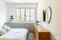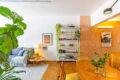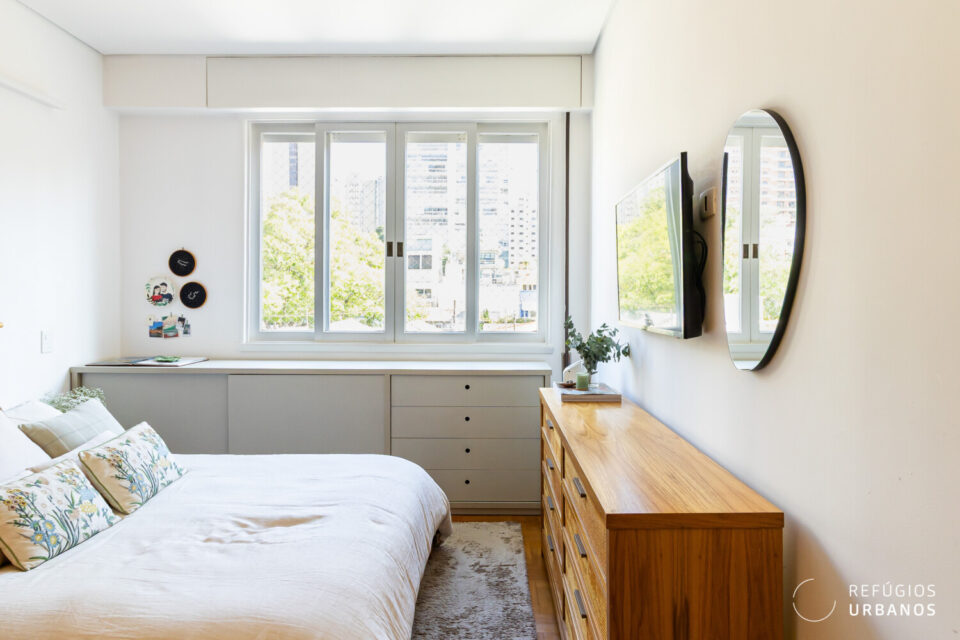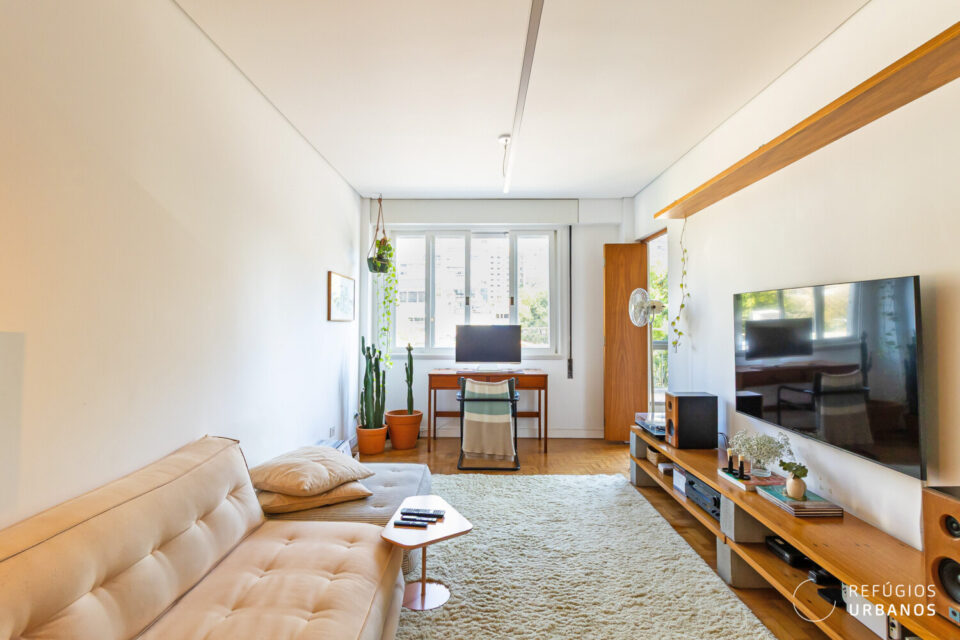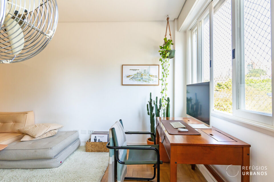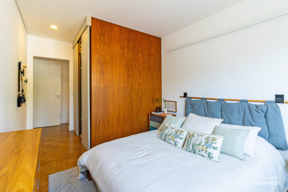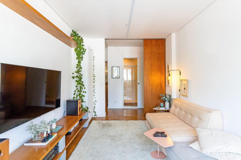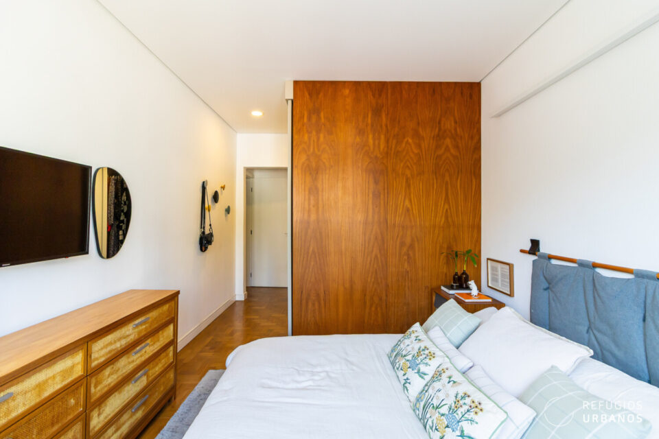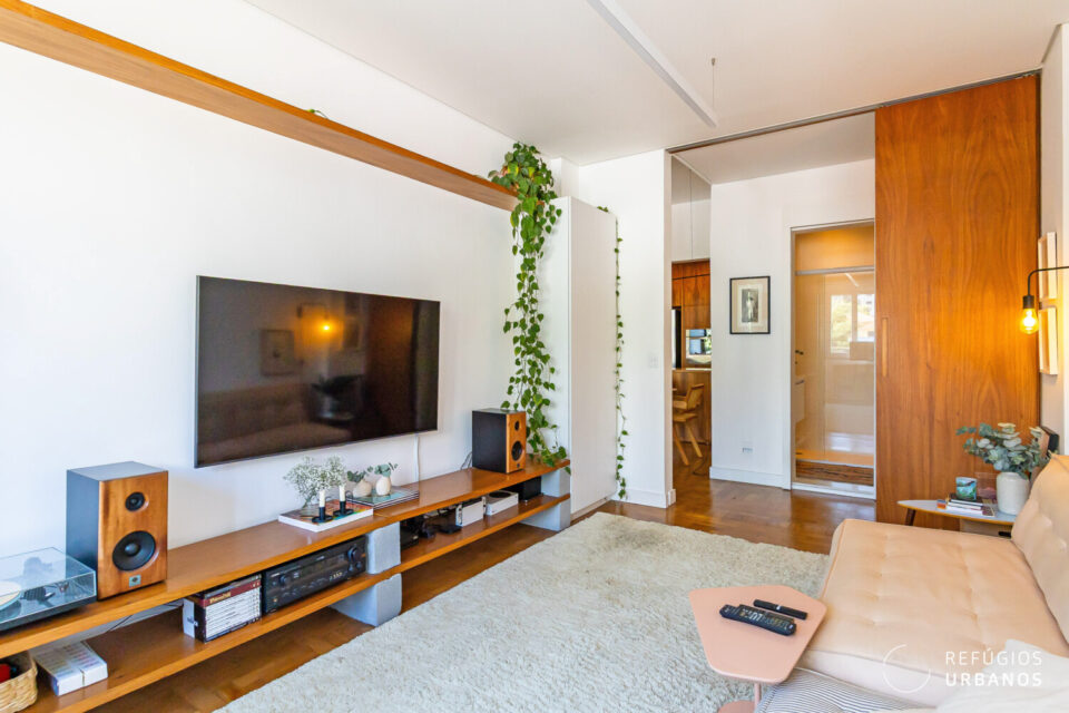 Na área íntima, um corredor elegante conduz aos dormitórios. O segundo dormitório, atualmente sala de TV/escritório, transforma-se em um aconchegante quarto de hóspedes ao fechar a porta de correr em madeira.