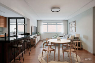 Originalmente com 3 dormitórios, essa planta foi repensada para privilegiar a área social: um dos quartos foi integrado à sala, ampliando o espaço e criando o ambiente perfeito para quem curte interagir em família e/ou receber. A nova configuração trouxe mais amplitude, ventilação e  iluminação natural, tornando o local ainda mais agradável e acolhedor.