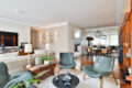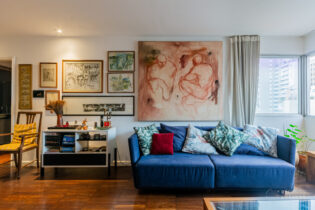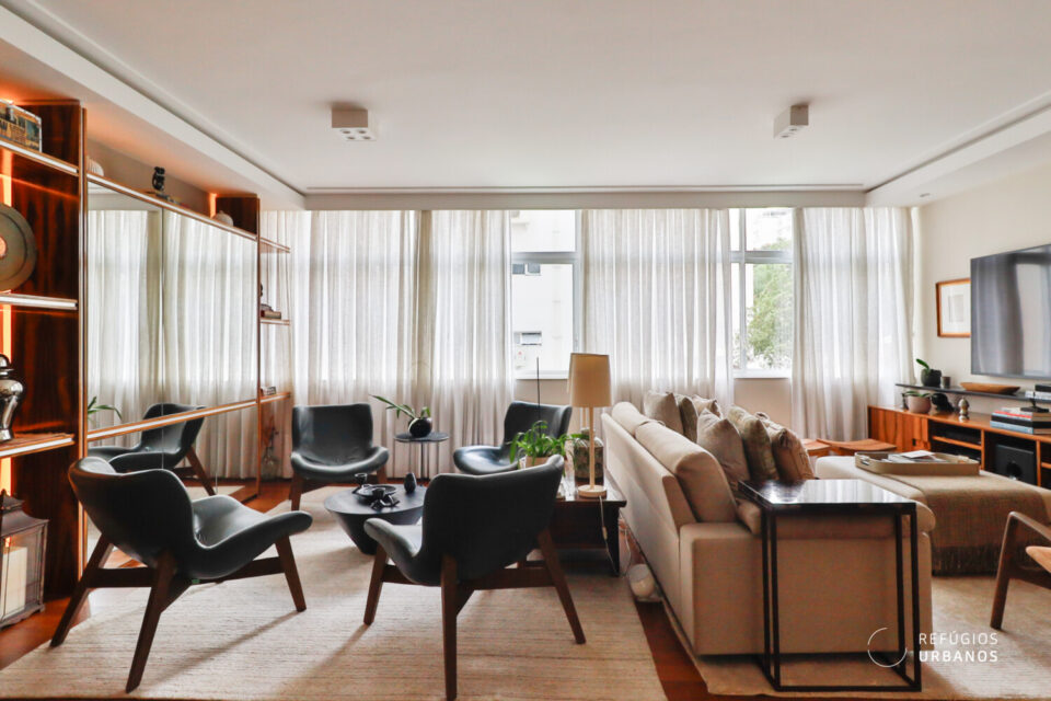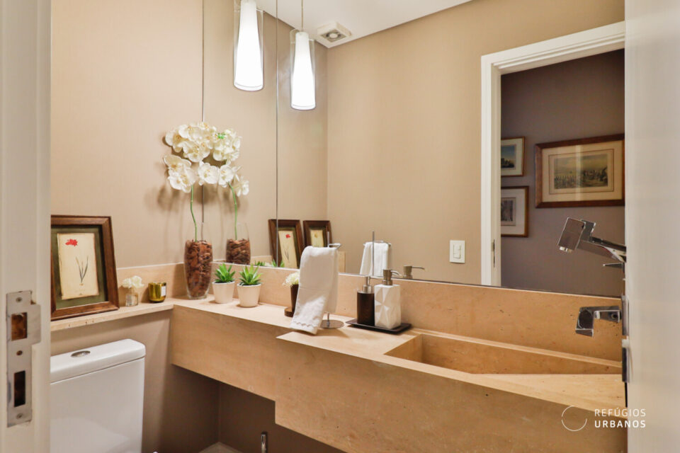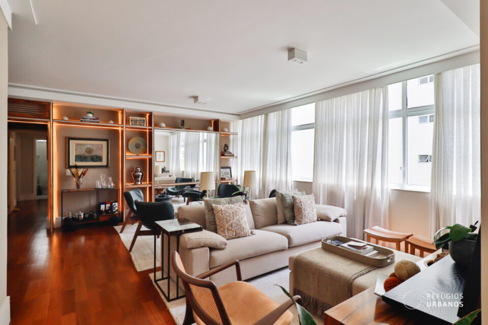 Começando pela área social do apartamento, somos recebidos por uma ampla e iluminada sala. A iluminação natural é um dos pontos altos do apartamento, que se torna possível graças ao janelão ponta a ponta. Além disso, a sala possui uma amplitude que permite que tenhamos 3 ambientes confortáveis dentro do layout atual. Há um lavabo que atende as visitas na área social.