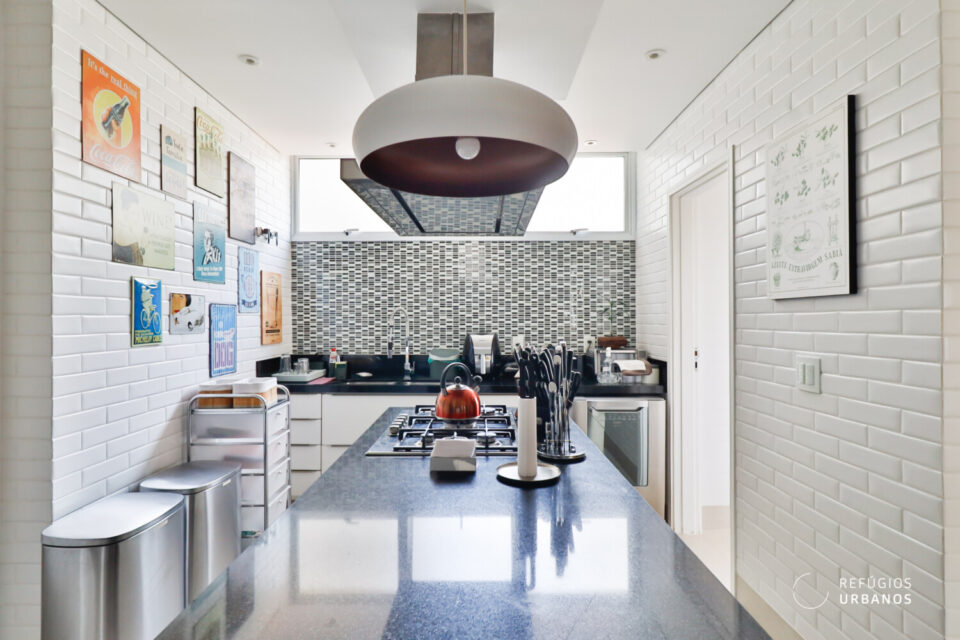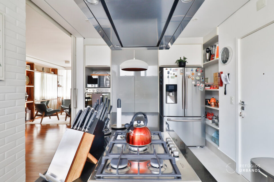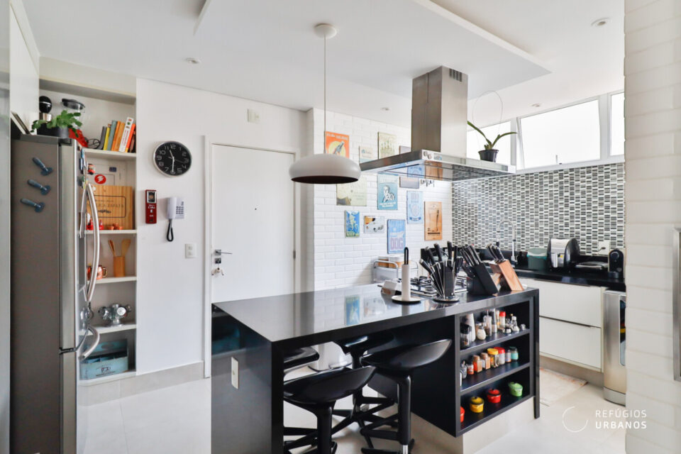 Cozinha e sala foram semi integradas criando a possibilidade de manter os ambientes interligados, com a porta de correr que separa os ambientes aberta. Ou separá-los caso prefira manter o cômodo mais reservado ao receber visitas.
