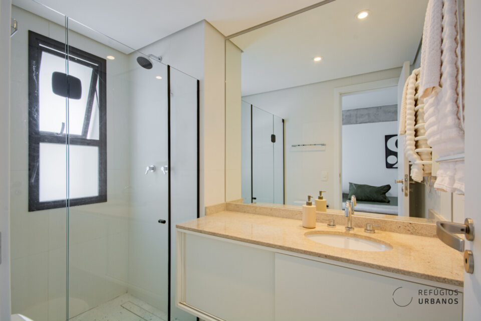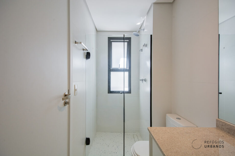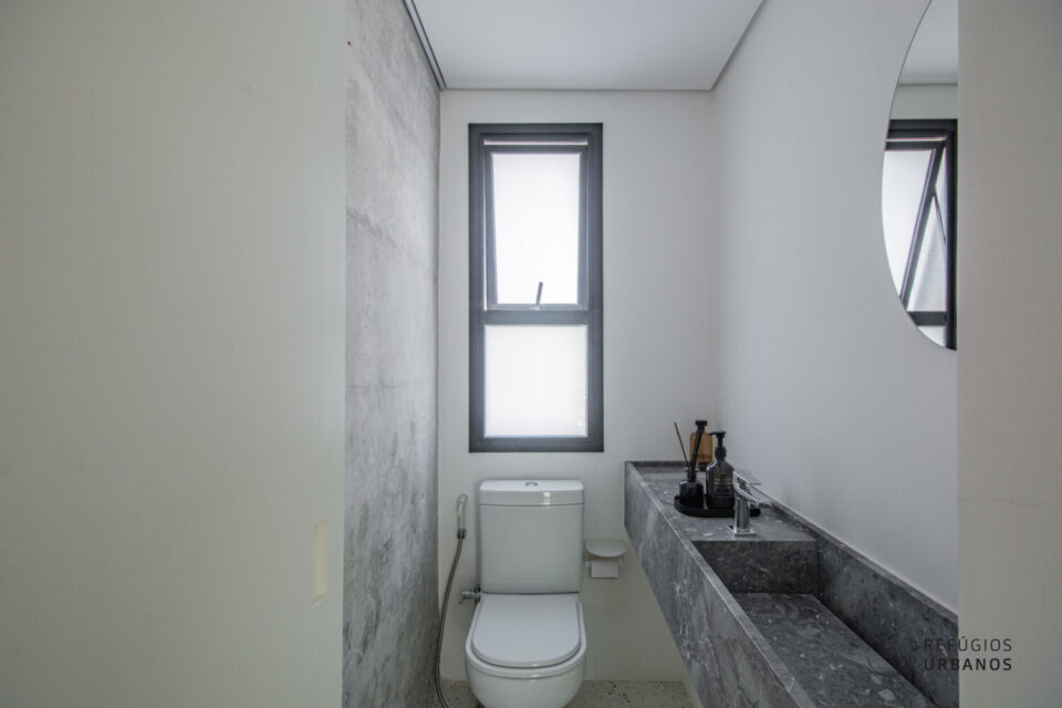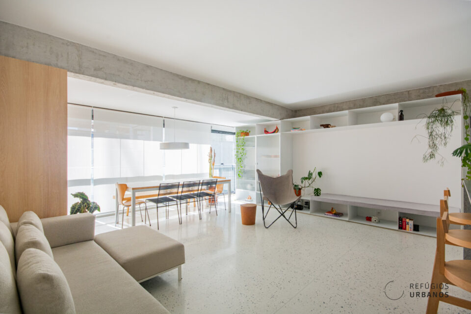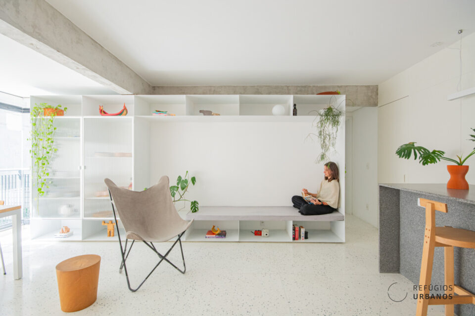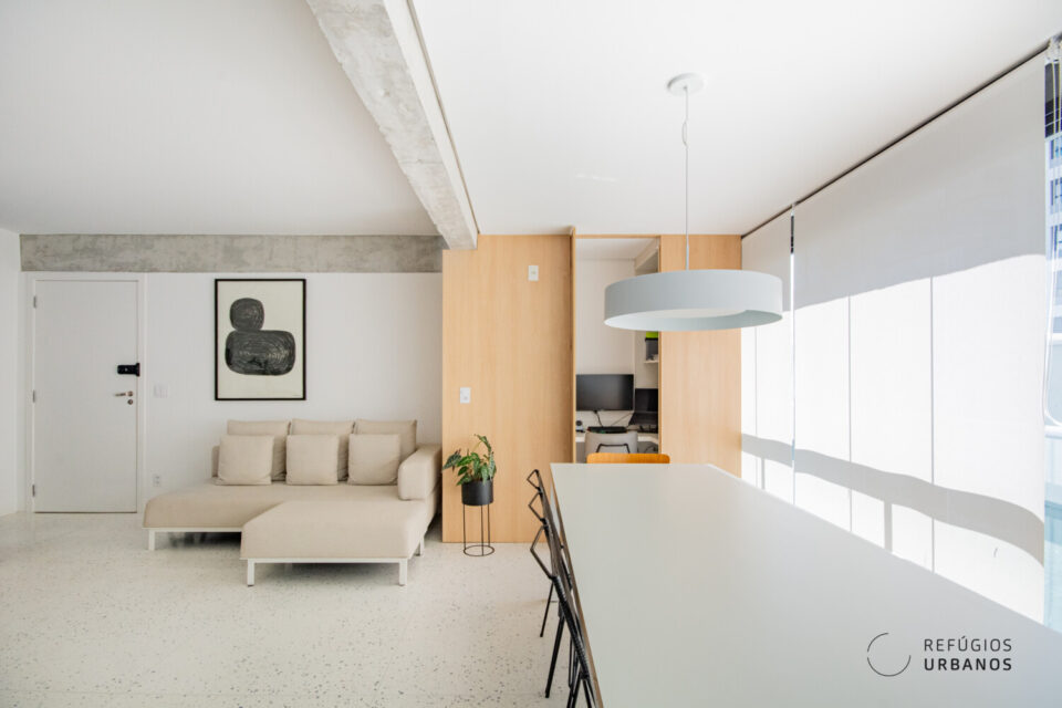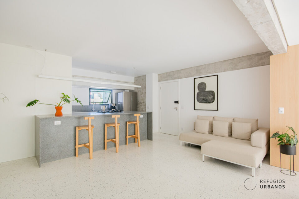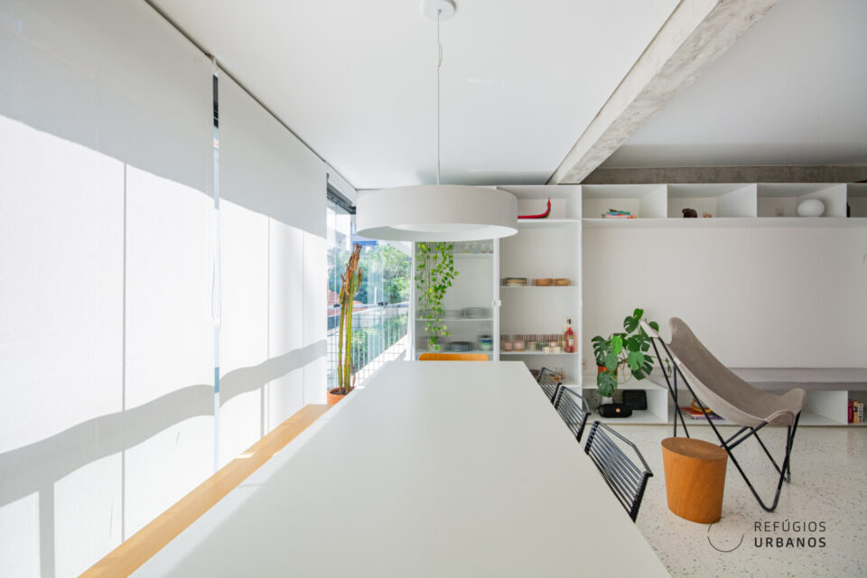 Primeiramente, ao entrar, nos deparamos com uma reforma impecável, com destaque na estante em serralheria na cor branca, trazendo muita elegância. Aqui, o Design está presente em todos os lugares e foi pensado pra você desfrutar de um ambiente “clean” e ao mesmo tempo aconchegante.