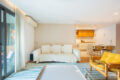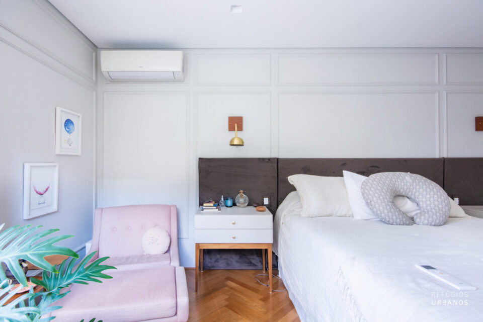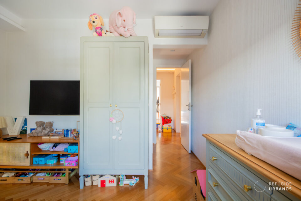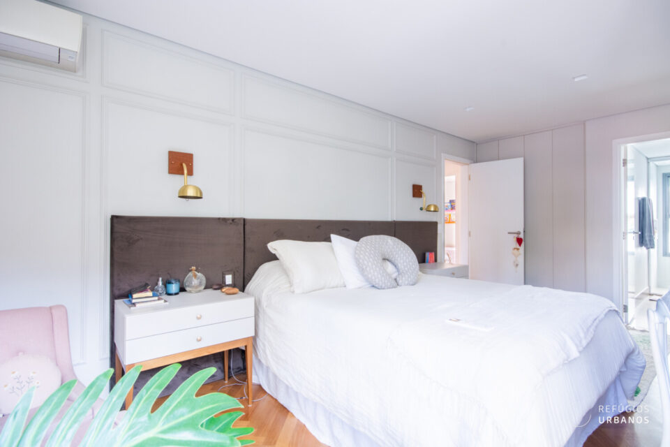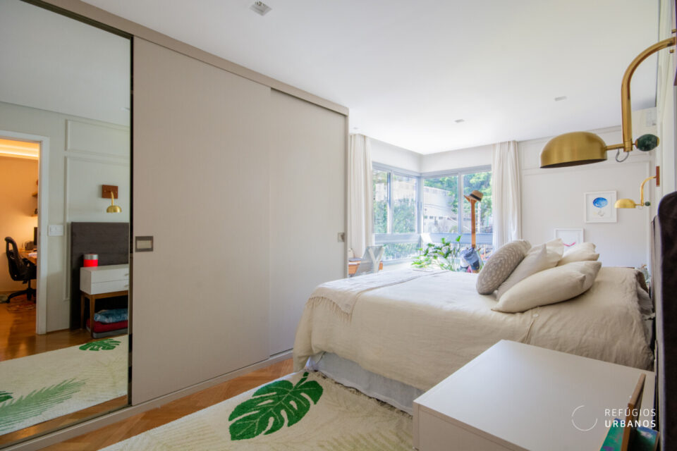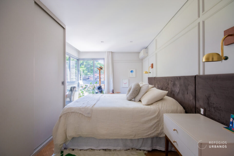 Logo adiante, temos três lindíssimas suítes! A principal se destaca pelo espaço generoso, bons armários e uma charmosa janela de canto que deixa a luz natural invadir o ambiente. Além disso, todas contam com ar-condicionado e marcenaria de qualidade.